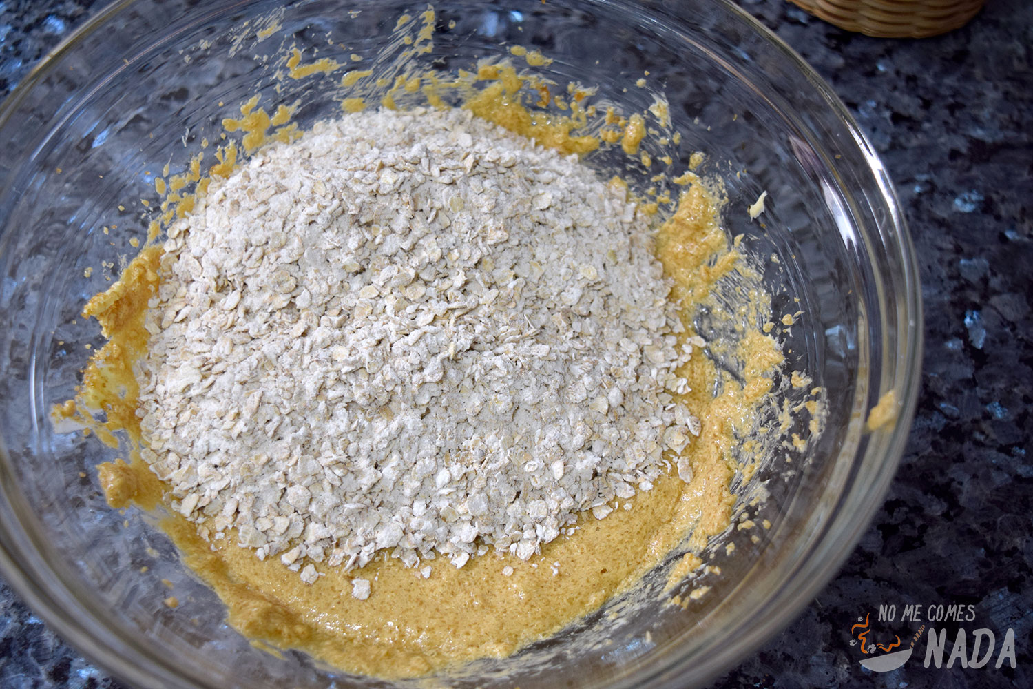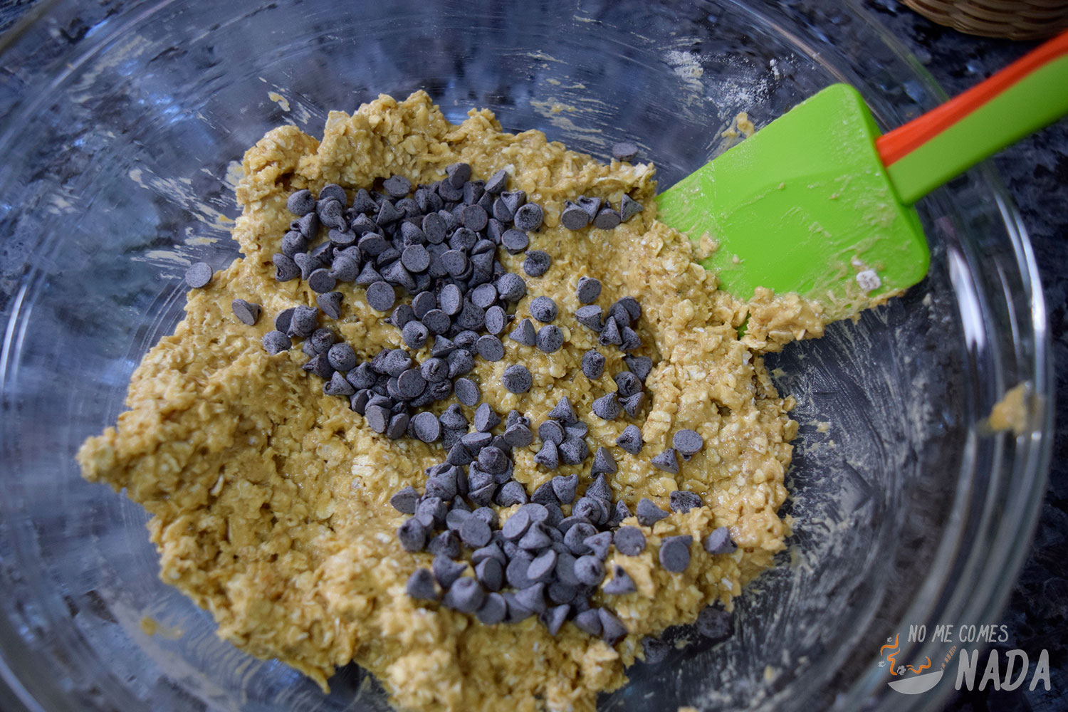 Vertemos la mezcla de copos en el bol donde tenemos la primera mezcla y, con ayuda de una espátula de silicona o madera, removemos hasta que todos los ingredientes estén bien repartidos y obtengamos una mezcla homogénea. Ya solo nos queda echar las pepitas de chocolate y volver a mezclar para tener la masa lista.