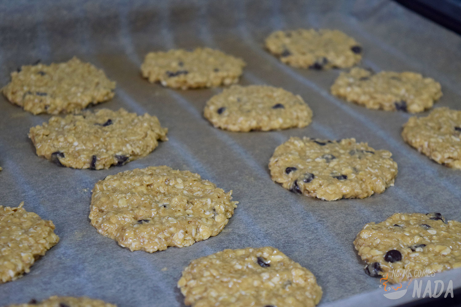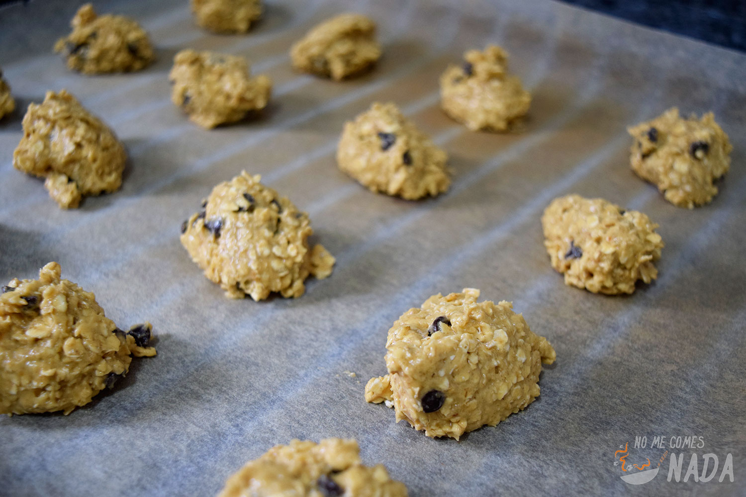 Ahora nos toca sacar bolitas de masa para formar las galletas. Podéis ayudaros de 2 cucharas para hacerlo o directamente con las manos untadas en aceite. Tened en cuenta que es una masa muy pegajosa. Según vayamos sacando bolitas de masa, las ponemos en una bandeja de horno sobre un papel vegetal. Una vez que estén todas en la bandeja, las aplanamos para darle forma de galleta (ahora sí os recomiendo hacerlo presionando con la mano untada con un poco de aceite).
