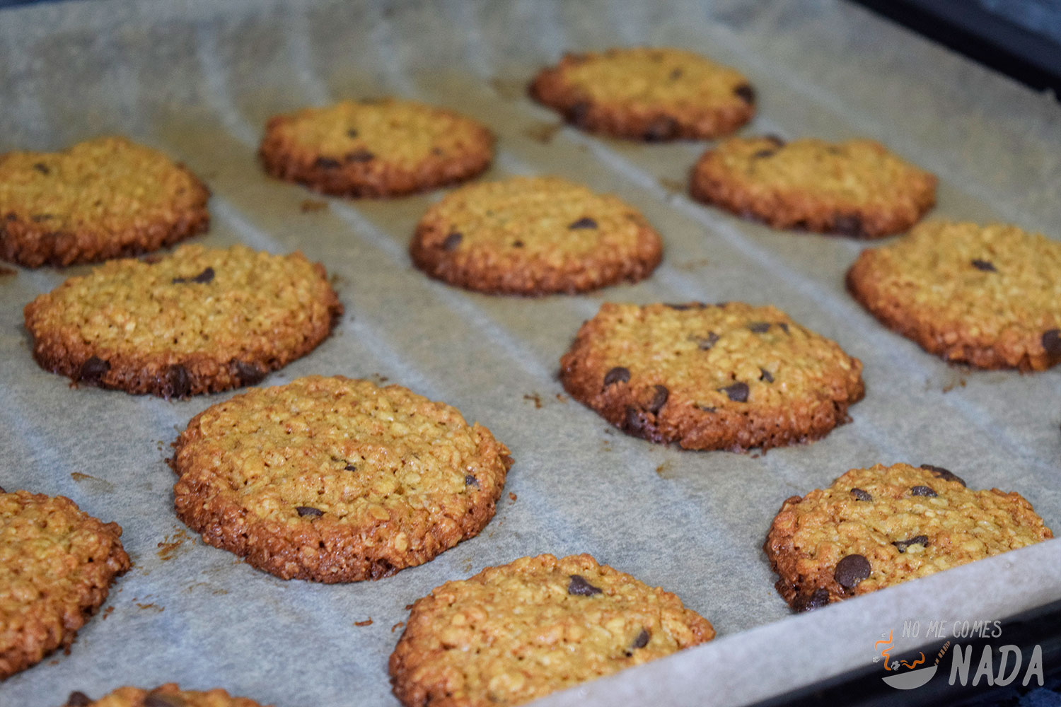 Metemos la bandeja con las galletas en el horno precalentado a 180ºC durante unos 15-20 minutos, hasta que las galletas estén doradas. Como siempre, cada horno es un mundo y habrá que estar muy atentos porque pueden pasar de estar en su punto a demasiado doradas en un momento.