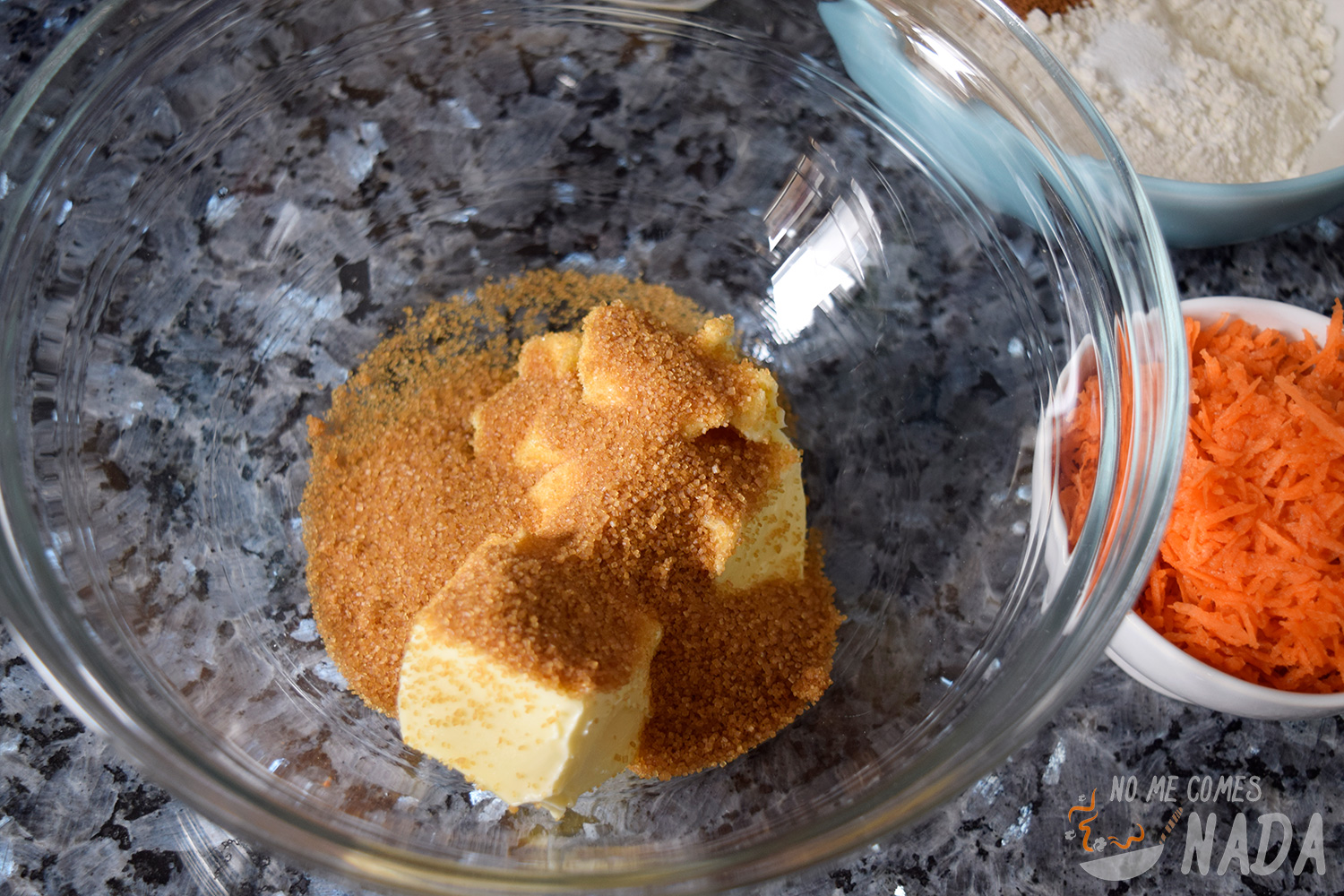 La mantequilla deberá estar en textura pomada, que podremos conseguirla dejando la mantequilla bastante tiempo fuera de la nevera o poniéndola en intervalos de pocos segundos en el microondas, hasta que tenga la textura que queremos (sin pasarnos y que se derrita) Dicho esto, en un bol amplio añadimos la mantequilla y el azúcar. Con unas varillas mezclamos hasta que esté todo bien integrado.