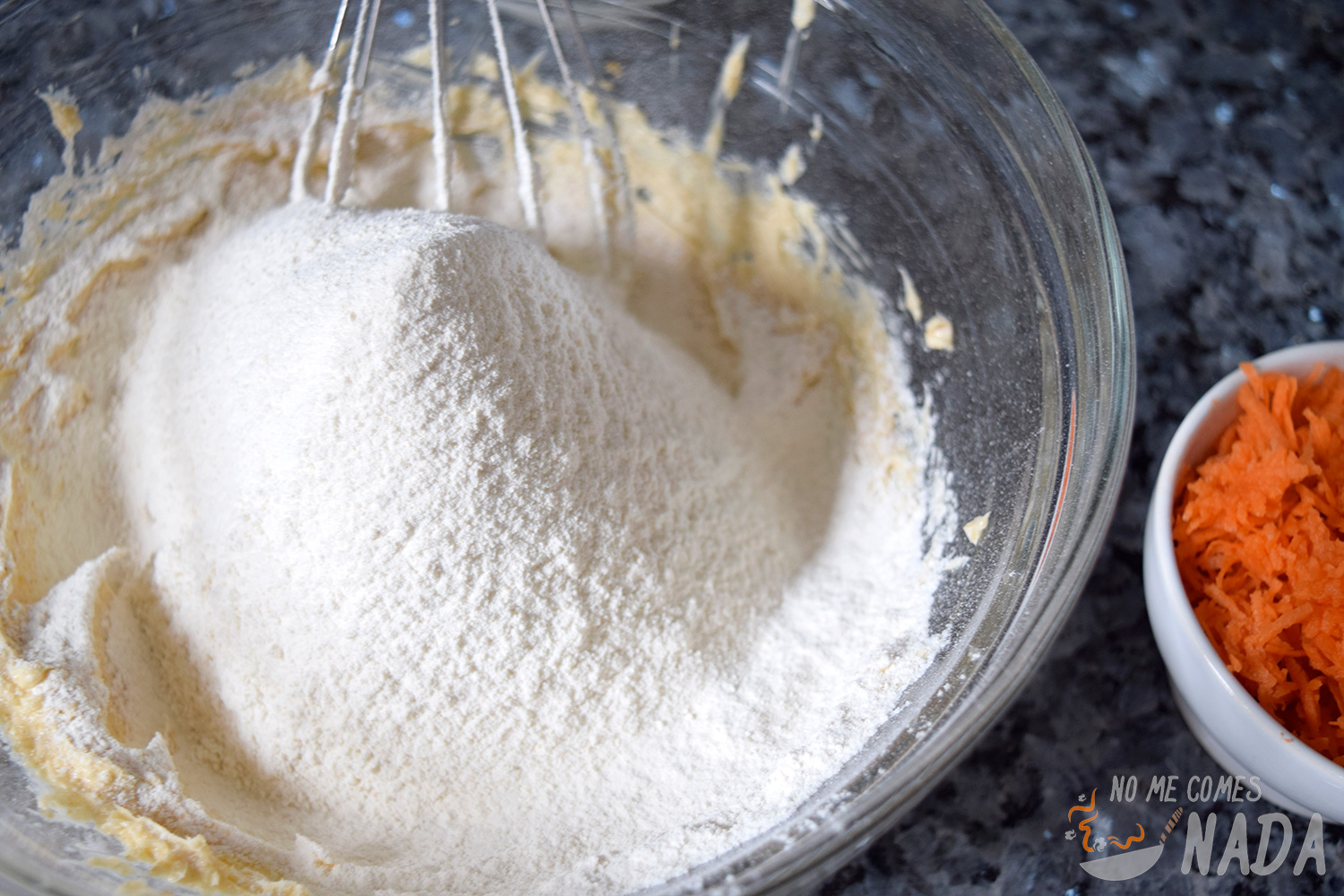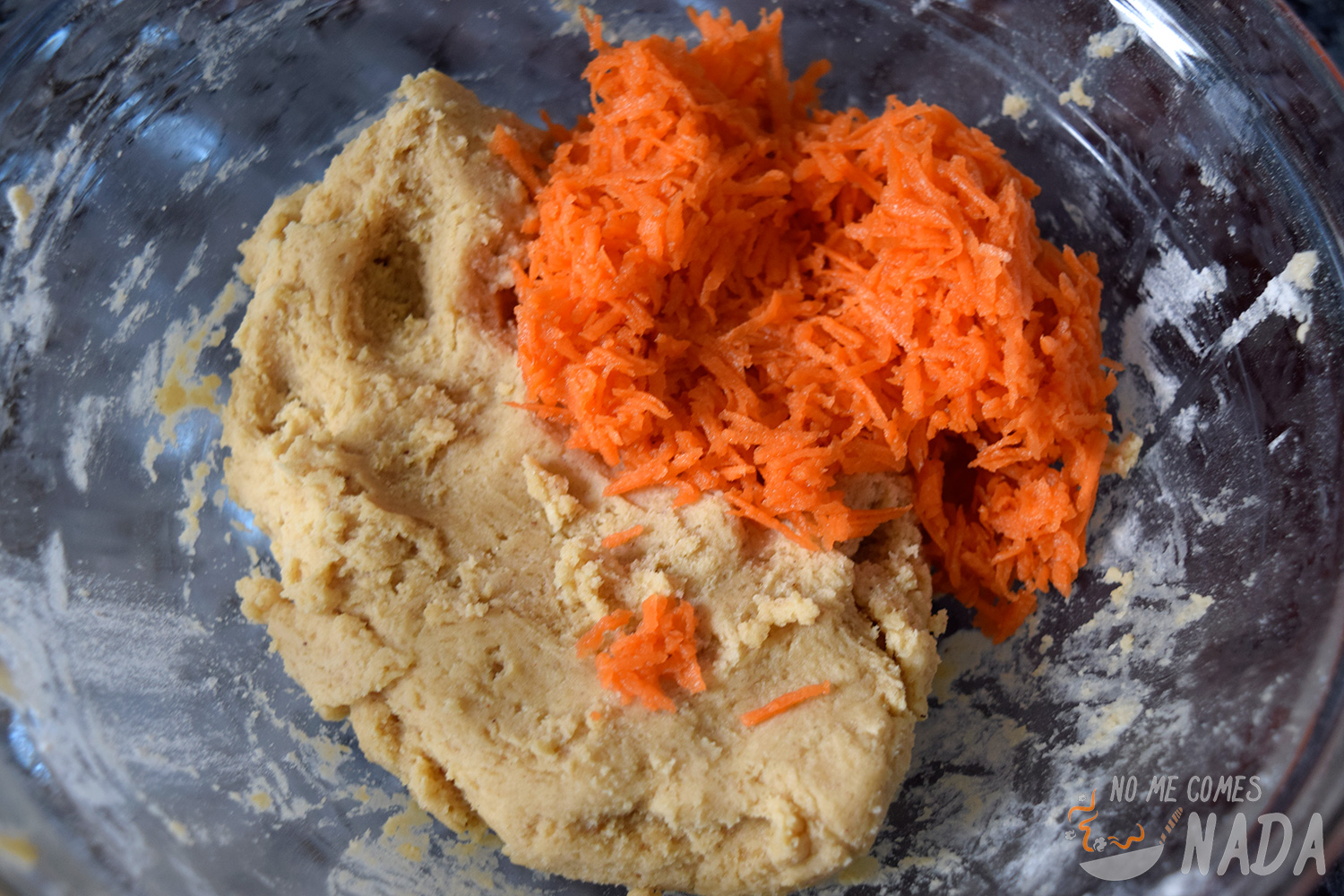 Añadimos la zanahoria rallada y, de igual manera, volvemos a mezclar hasta que la zanahoria esté bien integrada en la masa de las galletas.
