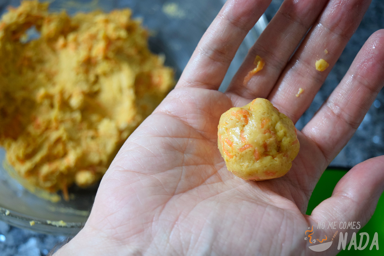 Una vez que tengamos la masa lista, vamos a pasar a darle forma a nuestras galletas de zanahoria. Con las manos ligeramente mojadas en agua para que no se nos pegue la masa, cogemos porciones de masa y, simplemente, hacemos una bola.