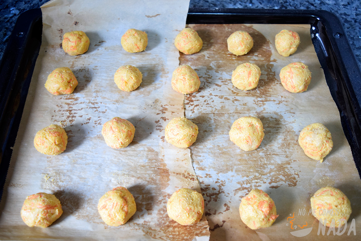 Colocamos las bolas de masa en la bandeja del horno, sobre papel de horno, con cierta distancia entre ellas porque luego se aplanarán un poco.