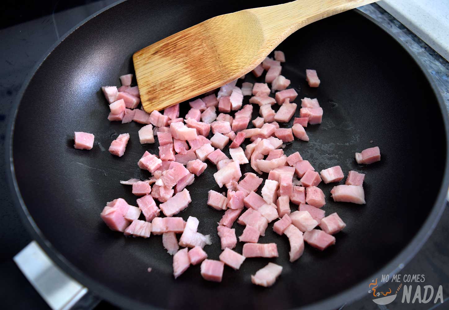 Ponemos una sartén a fuego medio y echamos el bacón, salteándolo hasta que esté bien doradito. No hace falta echar aceite de oliva porque se dora bien con la propia grasa que suelta.