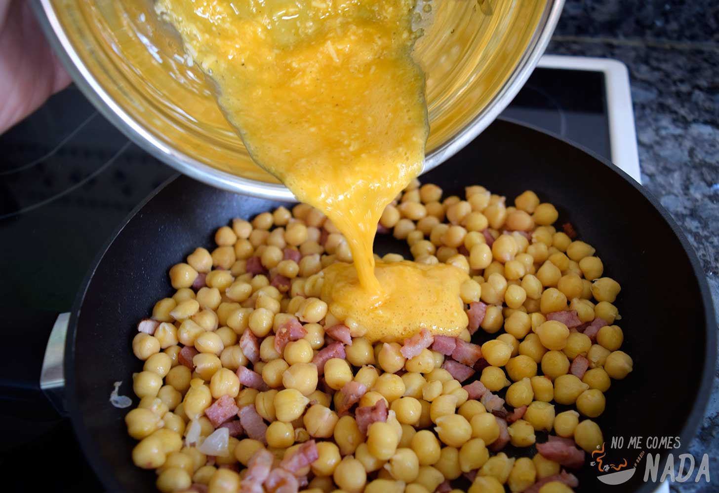 Mientras, batimos las yemas de huevos y los mezclamos con el queso parmesano rallado y una pizca de pimienta. Cuando el bacón esté listo, incorporamos los garbanzos a la sartén y salteamos un par de minutos más.