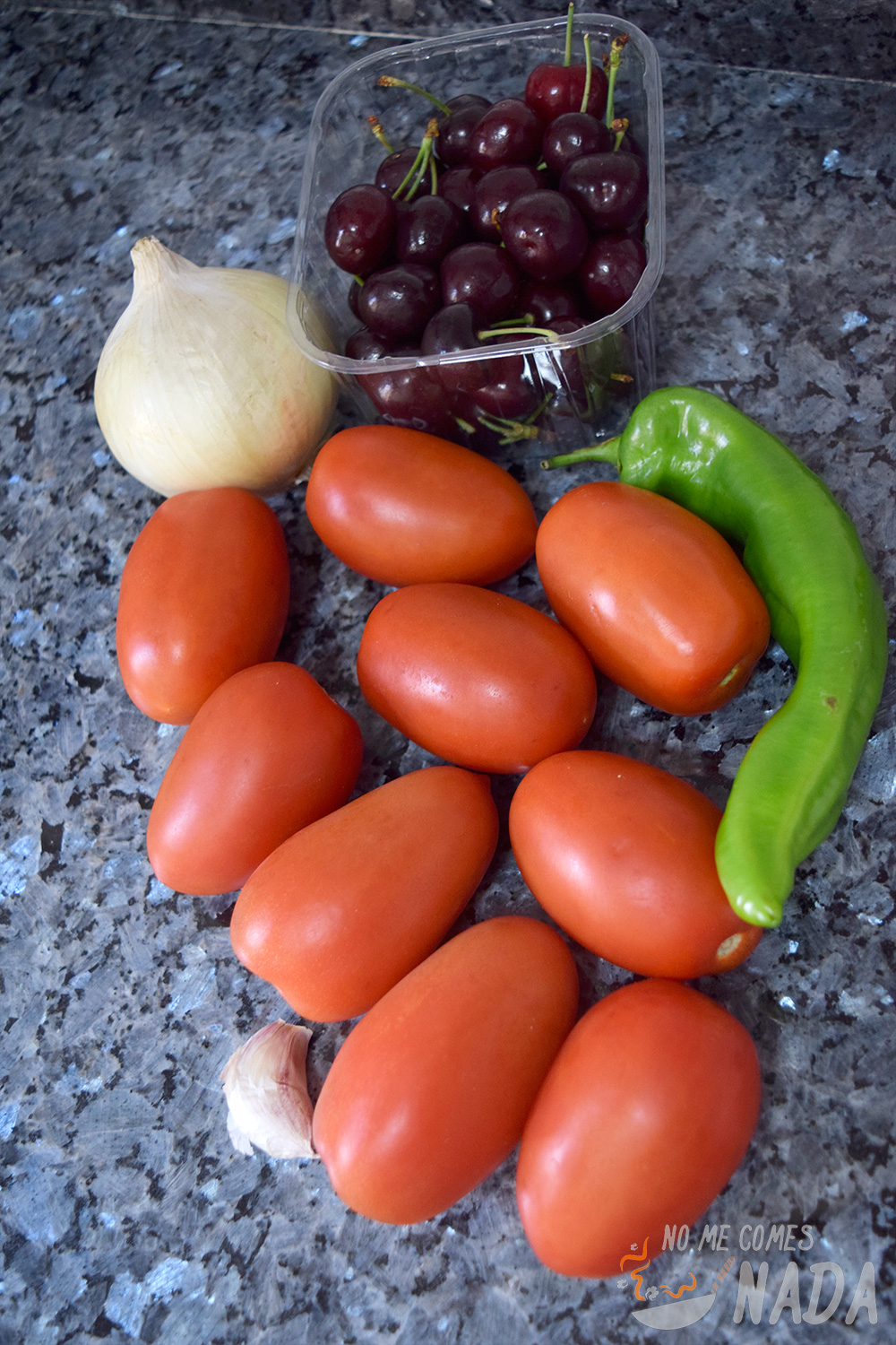Con las proporciones de tomate/cerezas que os he puesto, os sale un gazpacho con un ligero sabor a cereza, pero sin perder su esencia. Si queréis que sepa más, simplemente poned menos tomates y más cerezas