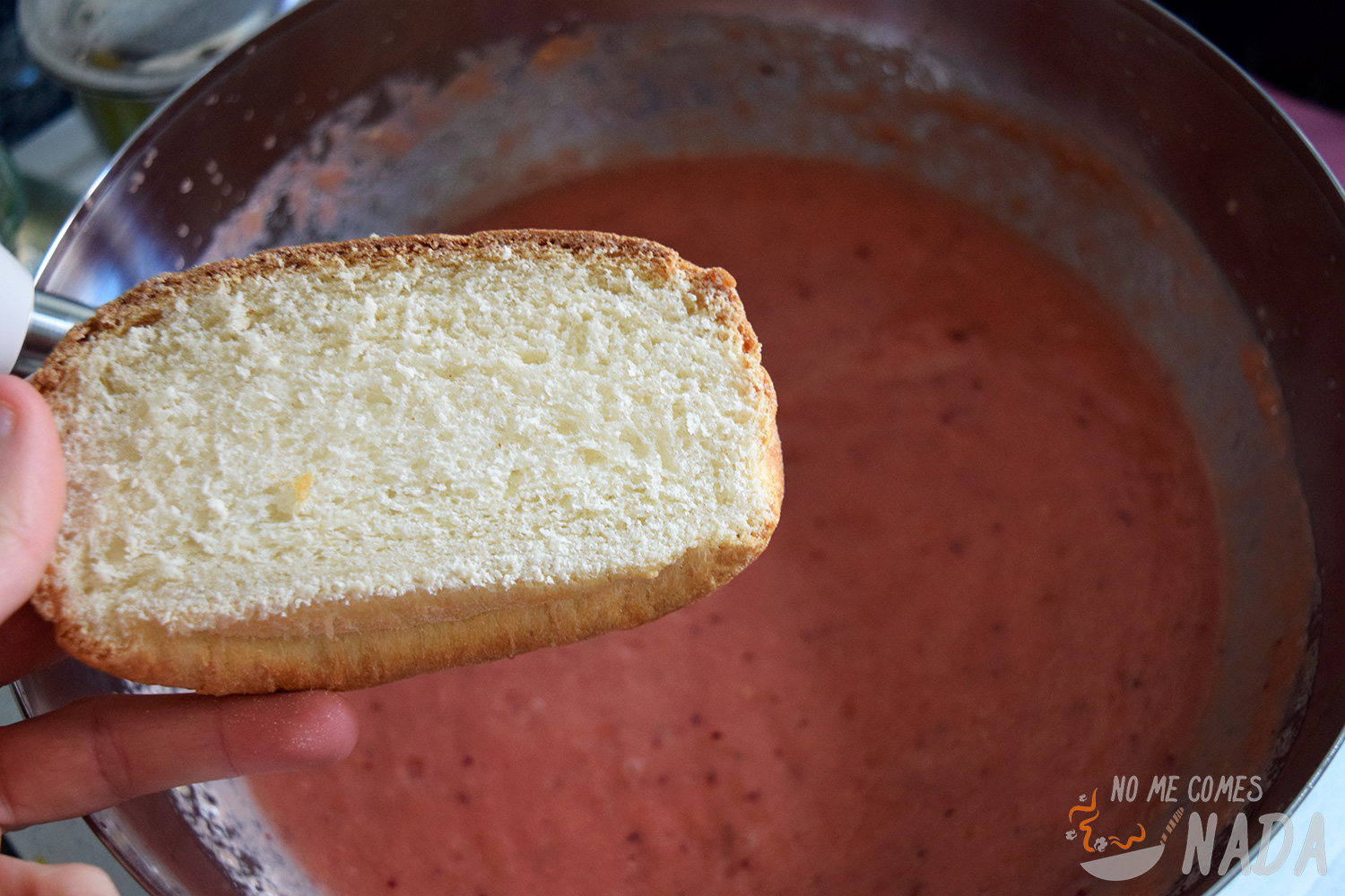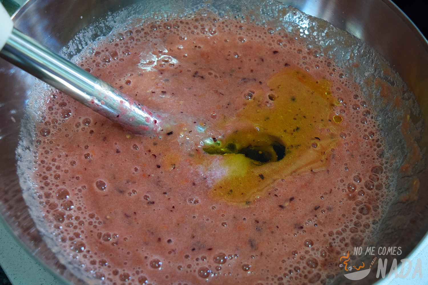 También comentaros que yo le puse un trozo de pan que tenía por la despensa (para aprovecharlo y que no se pusiese duro), por lo que me quedó un poco más textura de salmorejo.