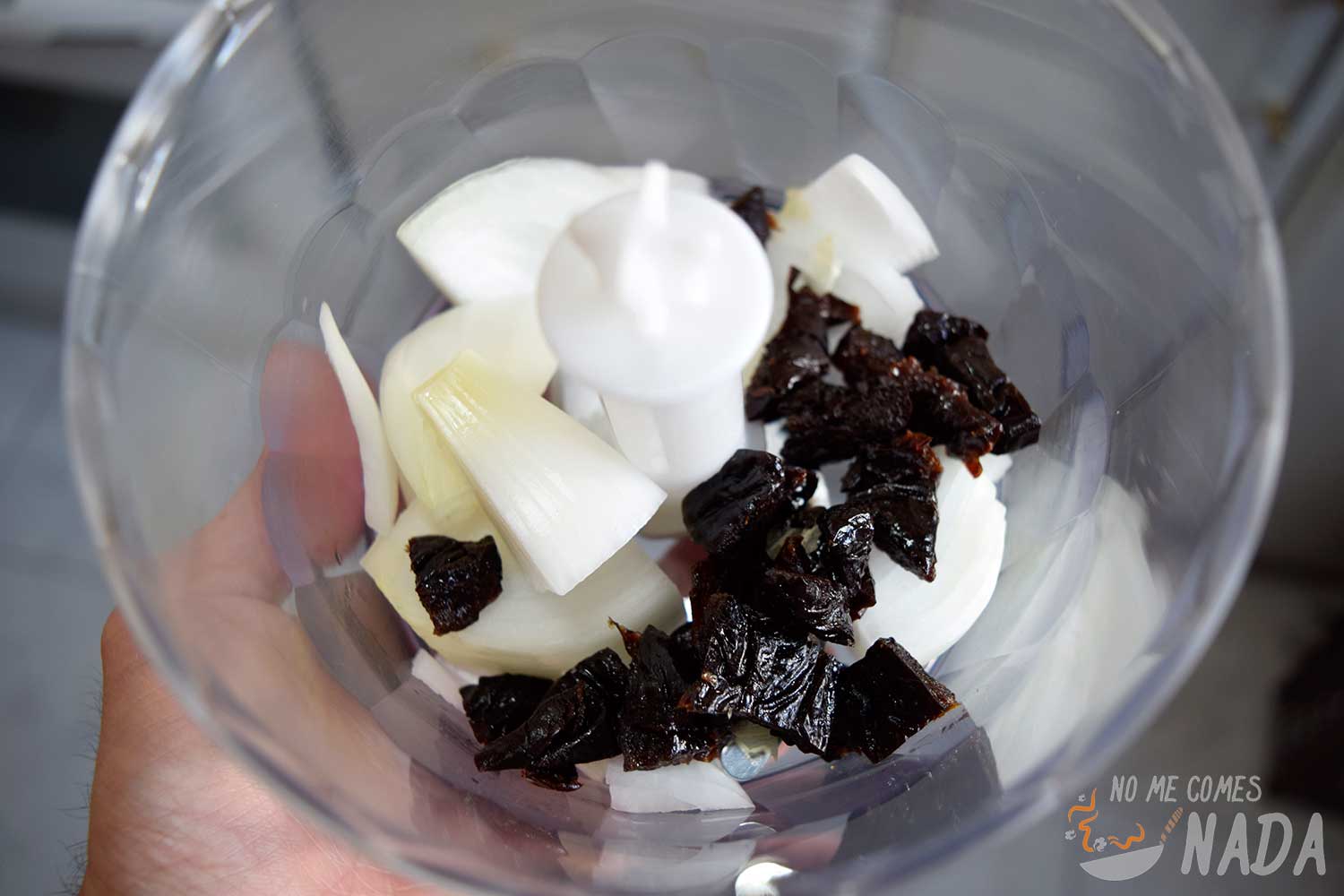 Picamos muy finamente la cebolla junto con las ciruelas pasas. Si tenéis una picadora, os hará todo el trabajo sino tendréis que sacar vuestra habilidad con el cuchillo
