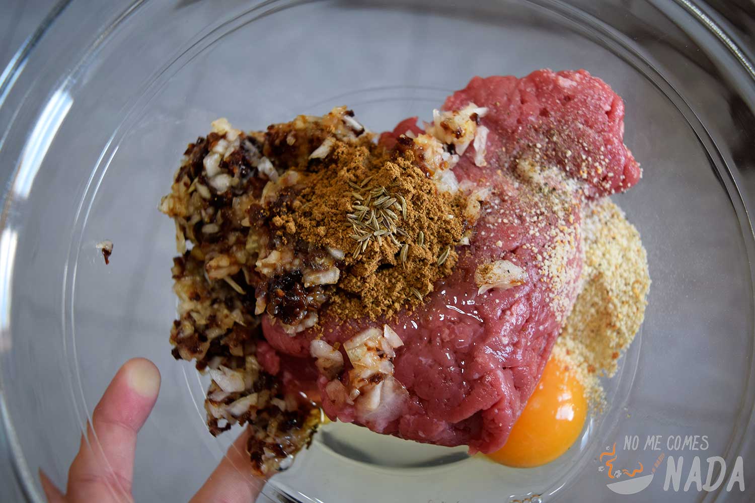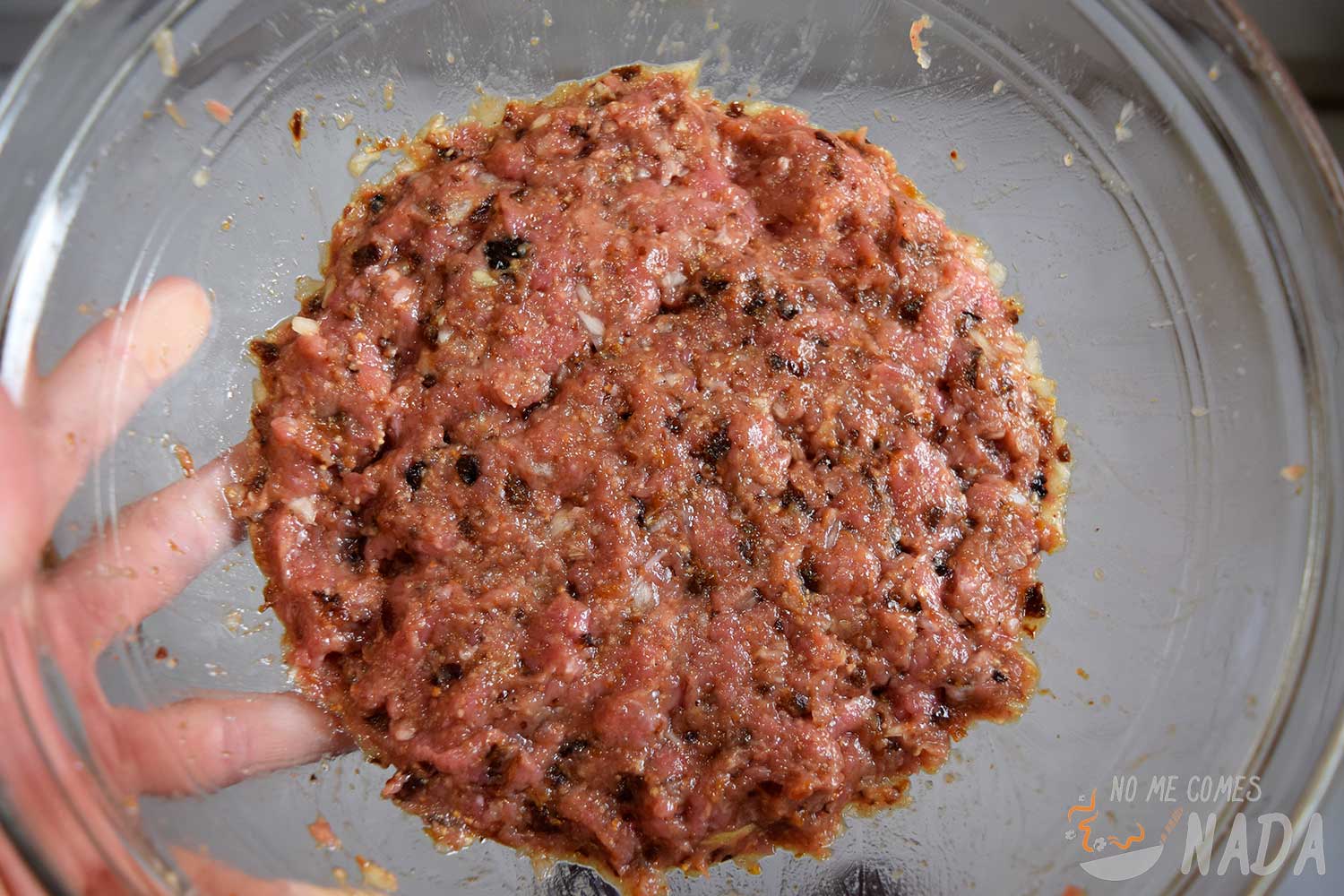En un bol amplio ponemos la carne picada junto con el resto de ingredientes y, sin miedo a mancharnos, mezclamos todo con las manos hasta obtener una masa lo más homogénea posible.