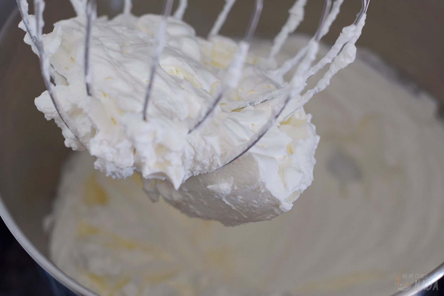 Si queréis añadir algún edulcorante a la nata, lo deberías hacer a mitad del batido/montado. En mi caso añadí un par de cucharadas de azúcar glass que me quedaba por la despensa.