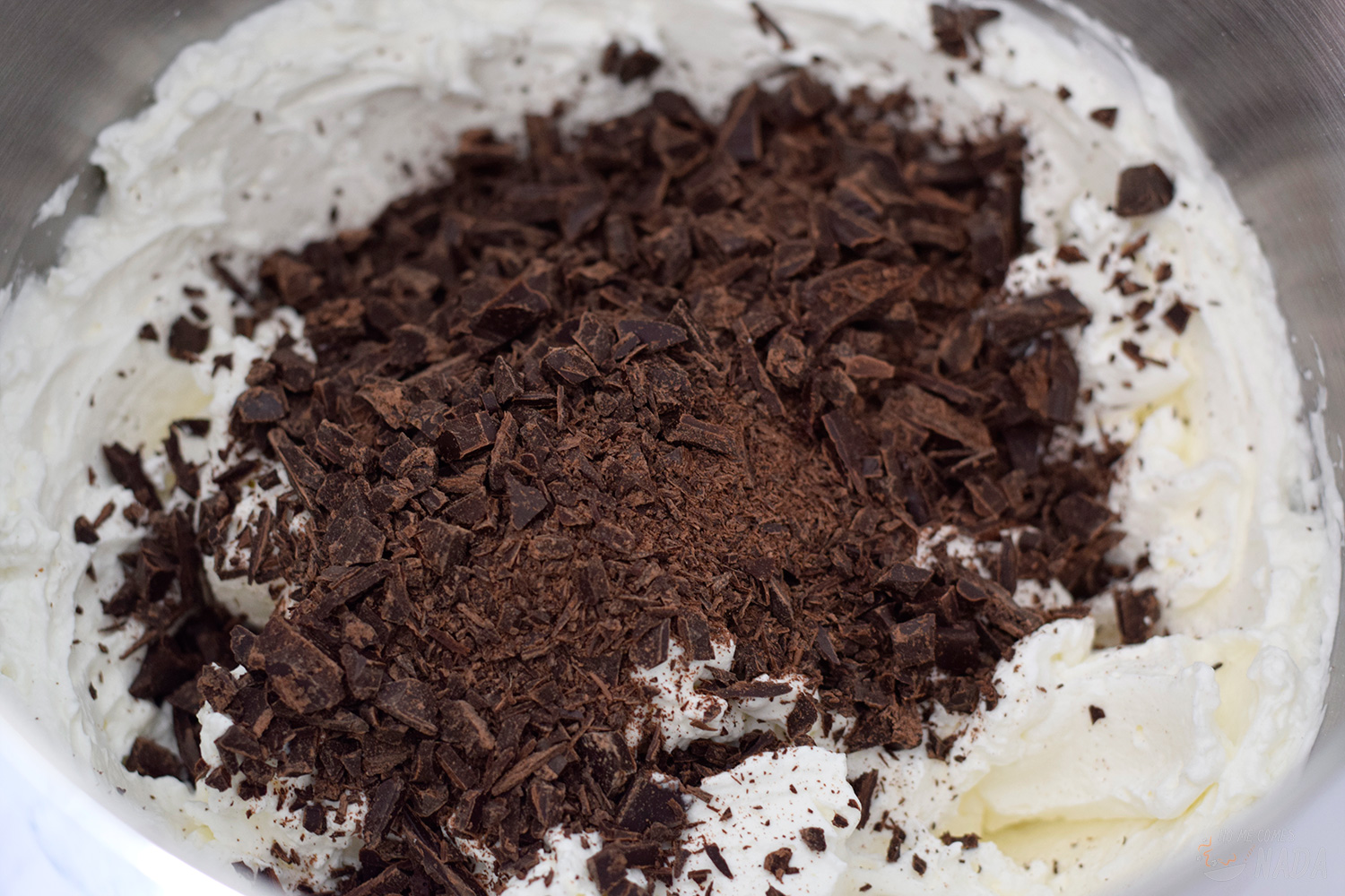 Ahora procedemos a trocear/picar el chocolate. Si sois mañosos, simplemente con un cuchillo bien afilado podéis hacerlo. Incorporamos el chocolate al bol con la nata montada y lo mezclamos con movimiento envolventes hasta que esté bien repartido.