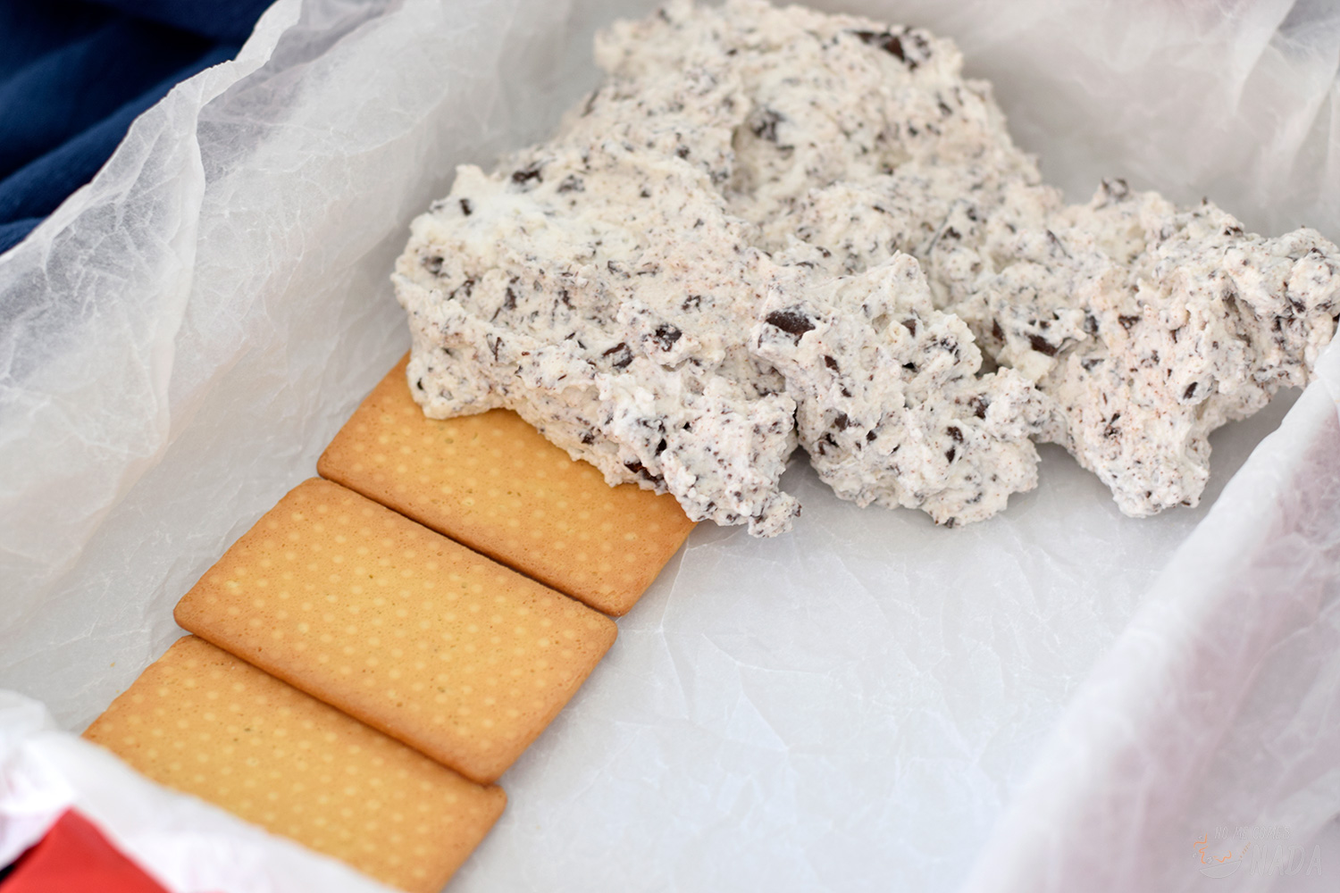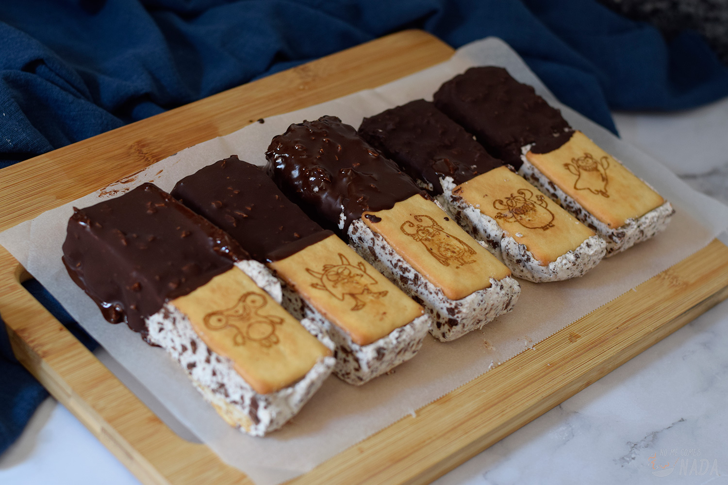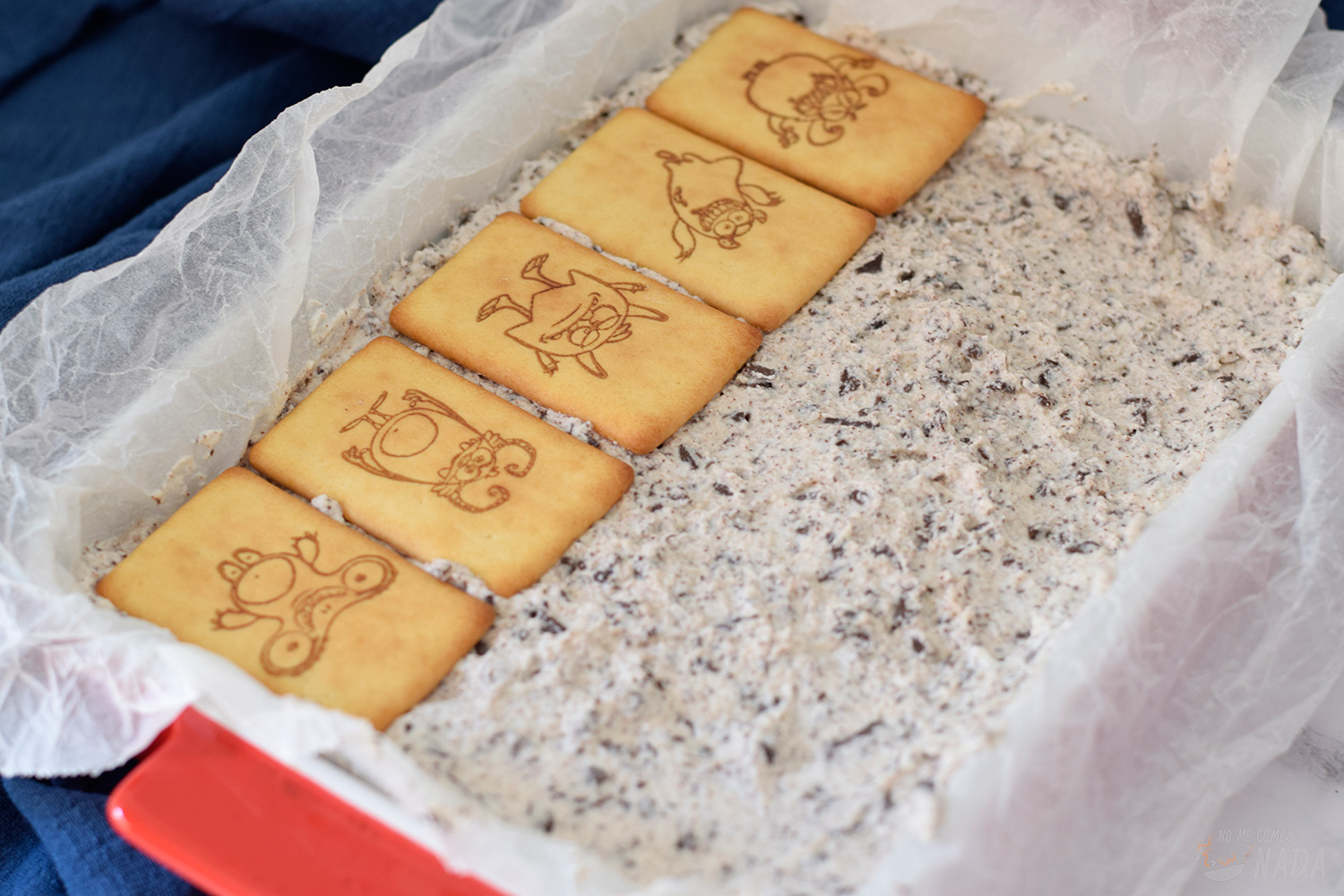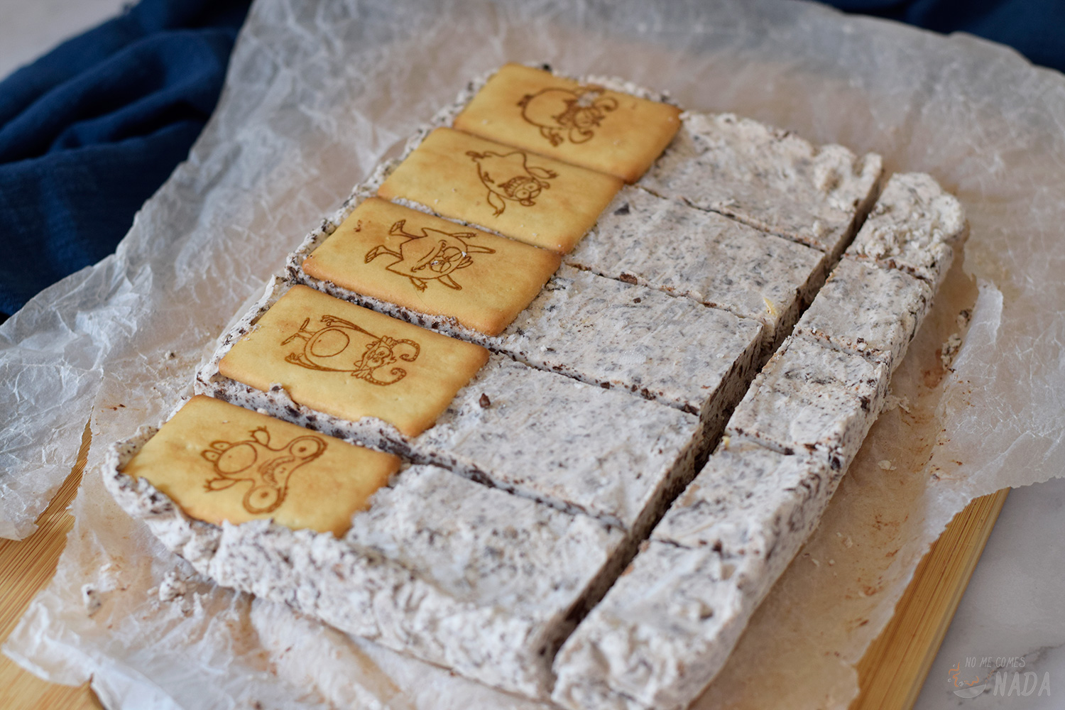 Forramos un molde con papel de horno y colocamos una fila de galletas. Cubrimos todo el molde con la mezcla de nata/chocolate y terminamos con otra fila de galletas. Prestad atención a que queden en la misma posición que las de abajo, para que cuando cortemos quede bien el “sándwich”. Tapamos con film y metemos al congelador un mínimo de 3 horas.