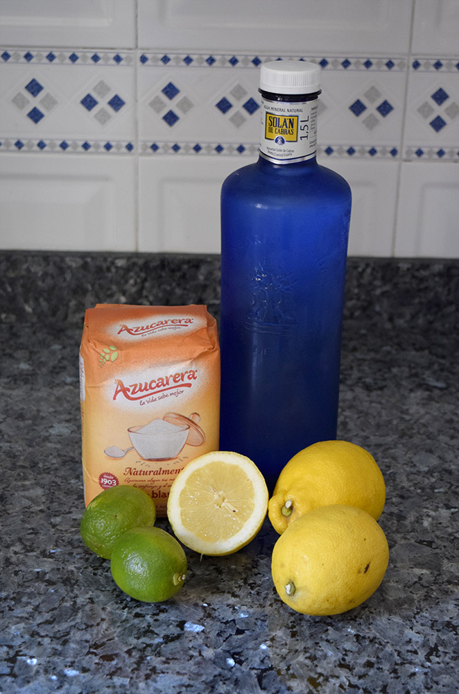 Cortamos los limones y las limas por la mitad y les quitamos unas rodajas finitas que nos servirán para decorar. Exprimimos el zumo de ambos cítricos.
