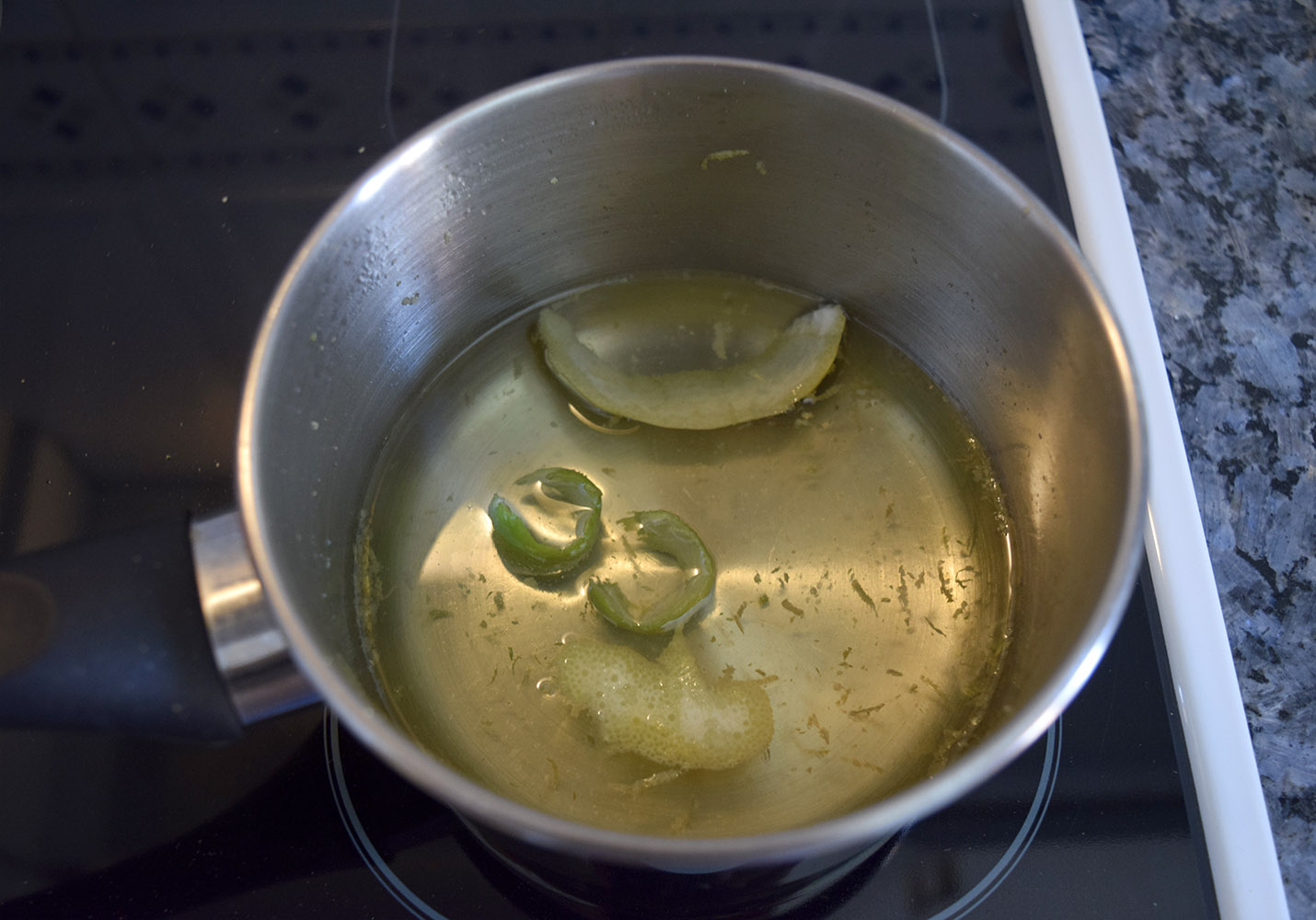 Pues bien, para realizar el jarabe pondremos en un cazo 200 ml de agua con los 100 gr de azúcar y lo llevamos a ebullición. Además, para darle más sabor podéis echar cortezas y/o ralladura de lima y de limón. Cuando el agua empiece a hervir, bajamos el fuego hasta dejarlo muy bajito y dejamos cocer unos 10 minutos. Pasado este tiempo, ya tendremos listo nuestro jarabe, lo quitamos del fuego y lo reservamos hasta que se enfríe.