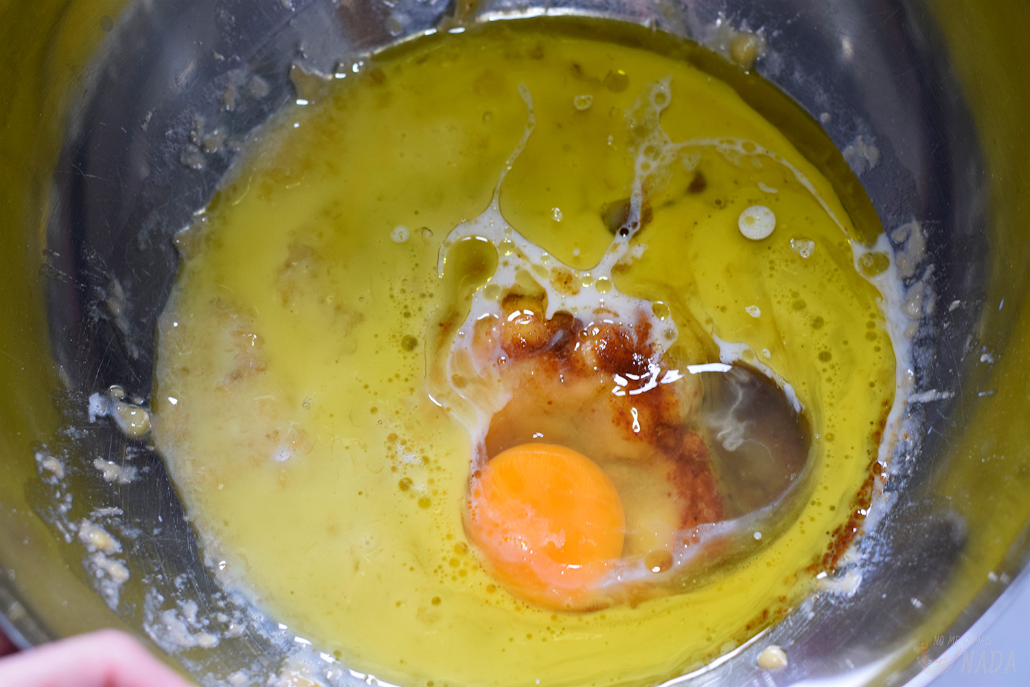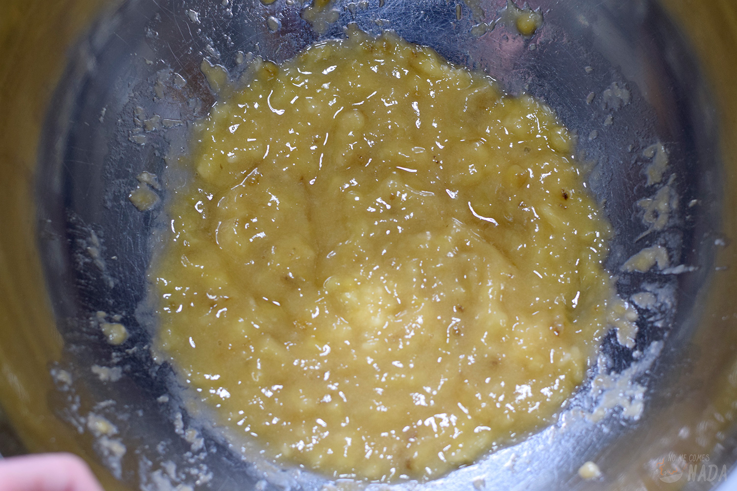 En un bol amplio machacamos los plátanos con ayuda de un tenedor hasta tener casi un puré. Añadimos los ingredientes “líquidos”, es decir, el huevo, el aceite, la miel y la leche. Con unas varillas batimos hasta que esté todo completamente integrado y lleno de burbujas (que la masa quede aireada).