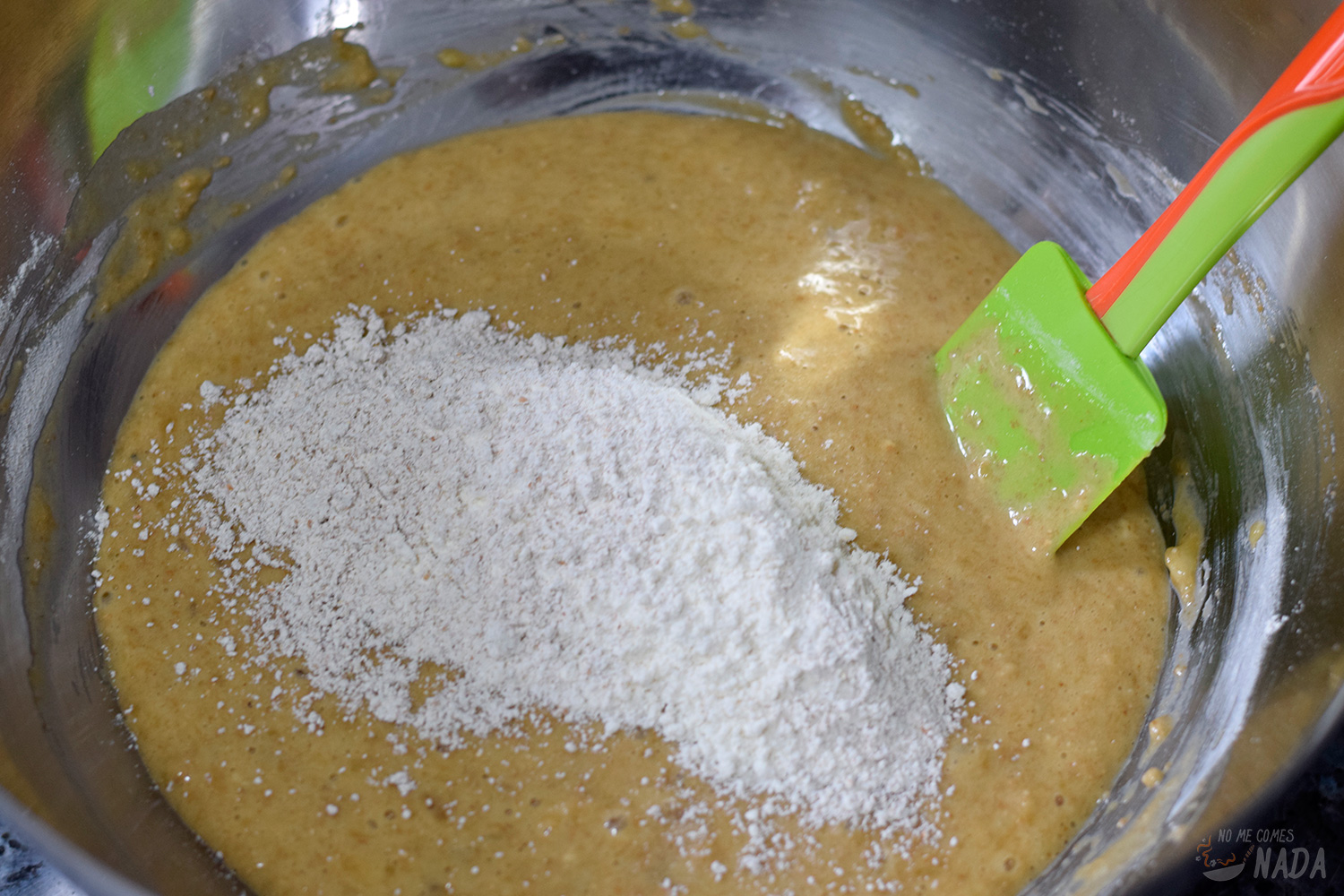 En otro bol mezclamos los siguientes ingredientes “secos”: harina, levadura y especias. Los incorporamos a la mezcla anterior, incorporándolos en 3 tandas. Cada vez que incorporemos removemos con una lengüeta de silicona hasta que se integren completamente a la masa. No es necesario batir, basta con mezclarlos bien.