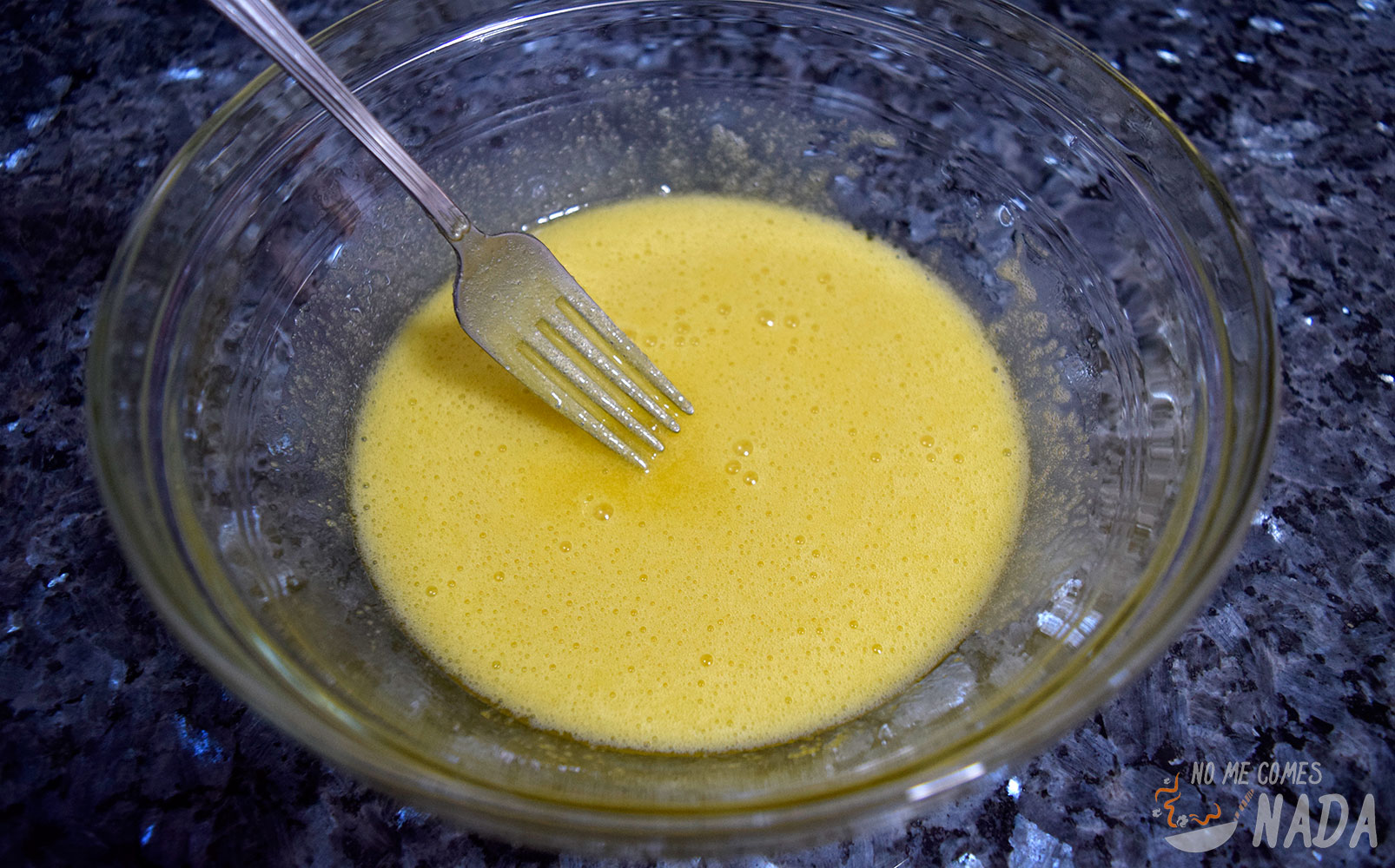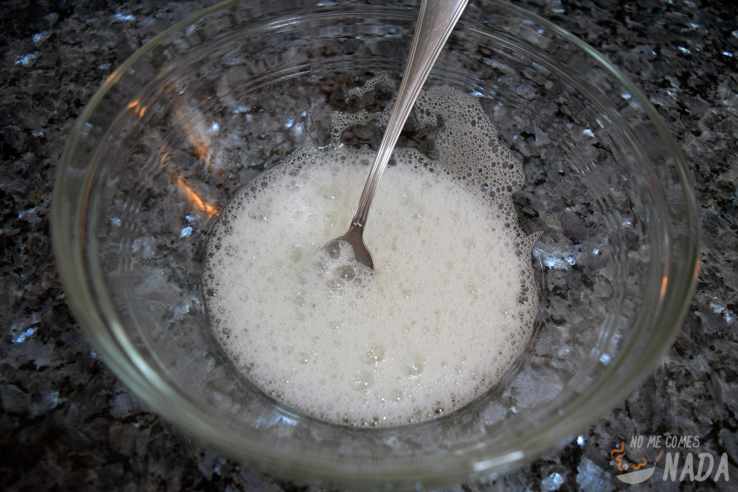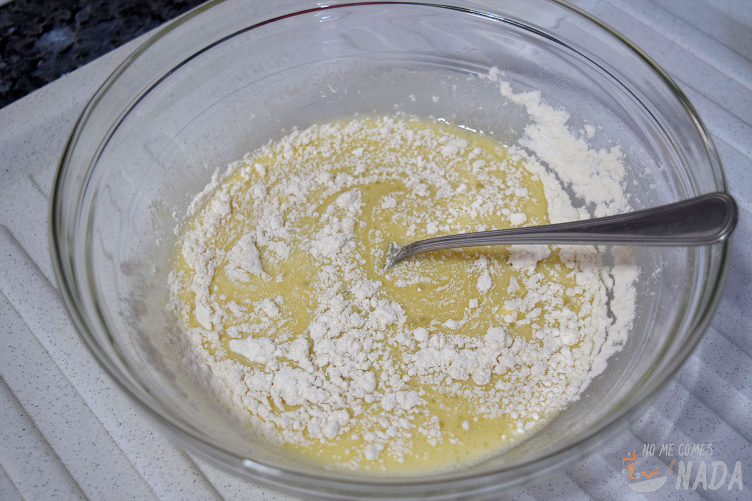 Ahora iremos incorporando el resto de los ingredientes, poco a poco y removiendo constantemente para que se integren todos en la masa. Echaremos el azúcar, la leche, el aceite, la harina y la levadura. Si podéis tamizar la harina al echarla, os facilitará que no se formen grumos. Al igual que antes, si tenéis una batidora de varillas os facilitará el trabajo pero yo en todo momento he usado un tenedor.
