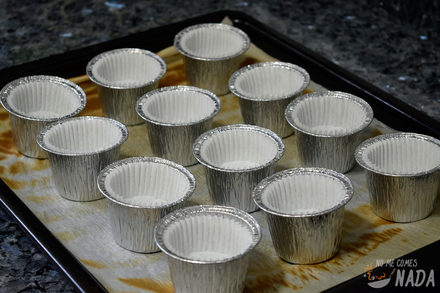 Mientras se enfría la masa, ponemos el horno a precalentar a unos 220ºC y vamos preparando los moldes. Además de los moldes de papel rizado necesitaremos unos moldes algo más rígidos puesto que el papel no aguantará lo suficiente y nuestras magdalenas podrían crecer a lo ancho más que a lo alto. Yo he utilizado unas flaneras desechables de aluminio pero también podéis usar moldes de silicona o unas bandejas de horno especiales para magdalenas que ya vienen con los huecos.