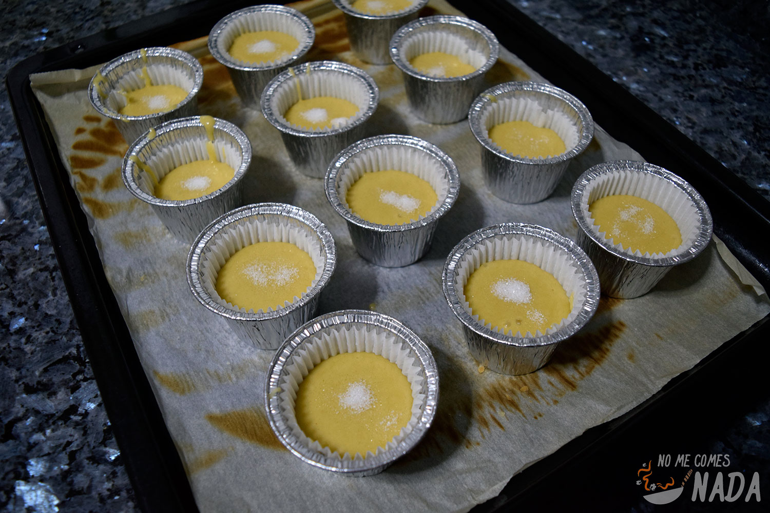 Una vez enfriada, sacamos la masa de la nevera y la batimos un poco para que se quede más líquida ya que al enfriarse habrá espesado. Rellenamos los moldes entre ½ y ¾ de su capacidad y espolvoreamos un poco de azúcar por encima de cada magdalena para que se forme la típica costra dulce que suelen tener.