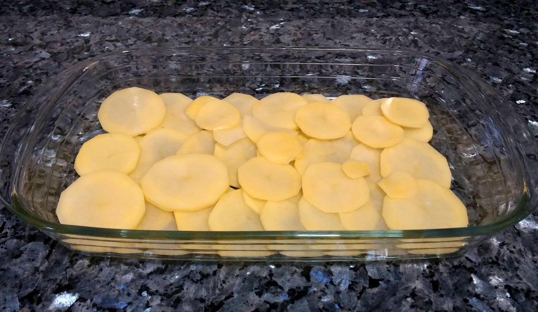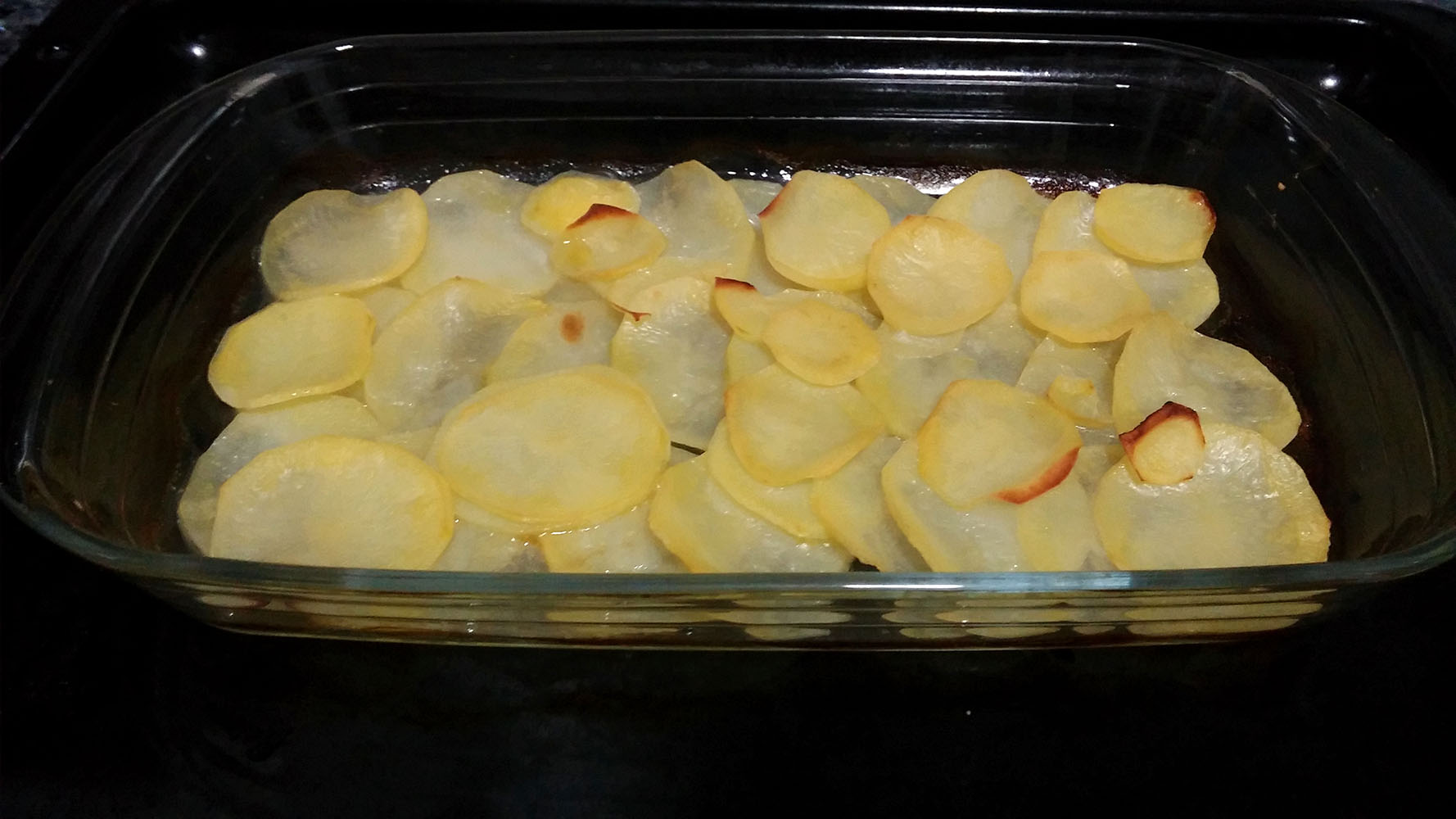 Cogemos una fuente apta para horno y ponemos la patata cortada en el fondo. Si os gusta podéis echar también cebolla (previamente pochada en la sartén) u otro tipo de verdura como tomate, pimiento, zanahoria, calabacín, etc. En este caso yo solo usé patata porque no tenía más nada a mano pero sí que he echado zanahorias más de una vez. Vertemos el vino y el agua y lo metemos al horno a unos 200ºC durante 30 minutos aproximadamente. Como siempre, todo depende de la potencia de vuestro horno y, en este caso, de cómo hayáis cortado de finas las patatas. El tiempo necesario es hasta que las patatas estén hechas, cosa que podréis comprobar pinchándolas para ver si están blandas.