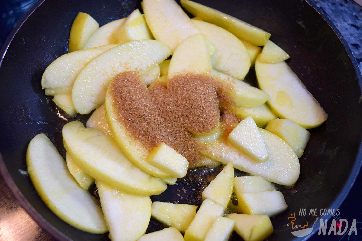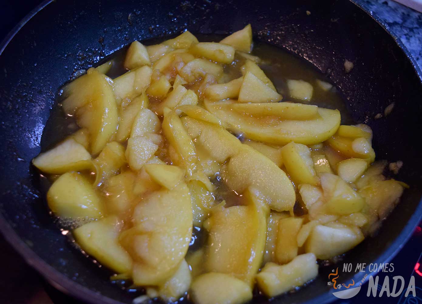 Vamos a empezar la preparación por la capa superior, la manzana caramelizada. Para ello, descorazonamos la manaza (la pelamos si queremos) y la cortamos en gajos. Ponemos una nuez de mantequilla en una sartén a fuego medio-bajo y, cuando esté derretida, añadimos la manzana troceada. Subimos un poco el fuego y salteamos un par de minutos. Volvemos a bajar el fuego, añadimos una cucharada de azúcar y dejamos que la manzana se caramelice.