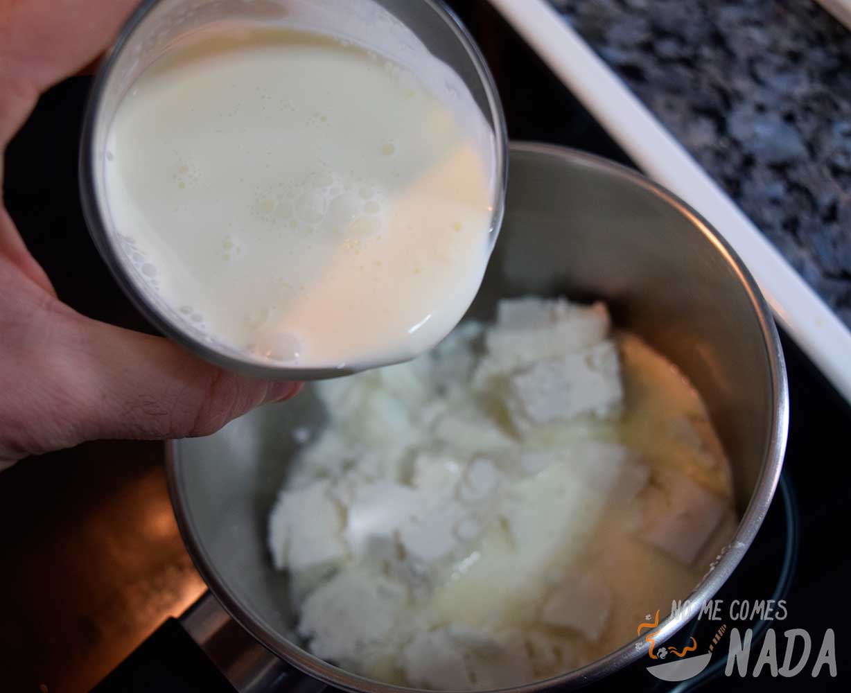 Lo siguiente será preparar la capa intermedia, la de queso de cabra. Empezaremos poniendo en remojo, en agua fría, una hoja de gelatina neutra durante unos 10-15 minutos. Mientras se hidrata la gelatina, iremos preparando esta capa. Simplemente troceamos el queso de cabra, lo ponemos a fuego medio en un cazo junto con 120 ml de nata y removemos hasta que esté totalmente disuelto, sin que llegue a hervir en ningún momento, solo queremos calentarlo. Una vez disuelto y pasado el tiempo necesario para hidratar la gelatina, retiramos el cazo del fuego, añadimos la hoja de gelatina escurrida y batimos enérgicamente con unas varillas hasta que la gelatina se disuelva por completo.