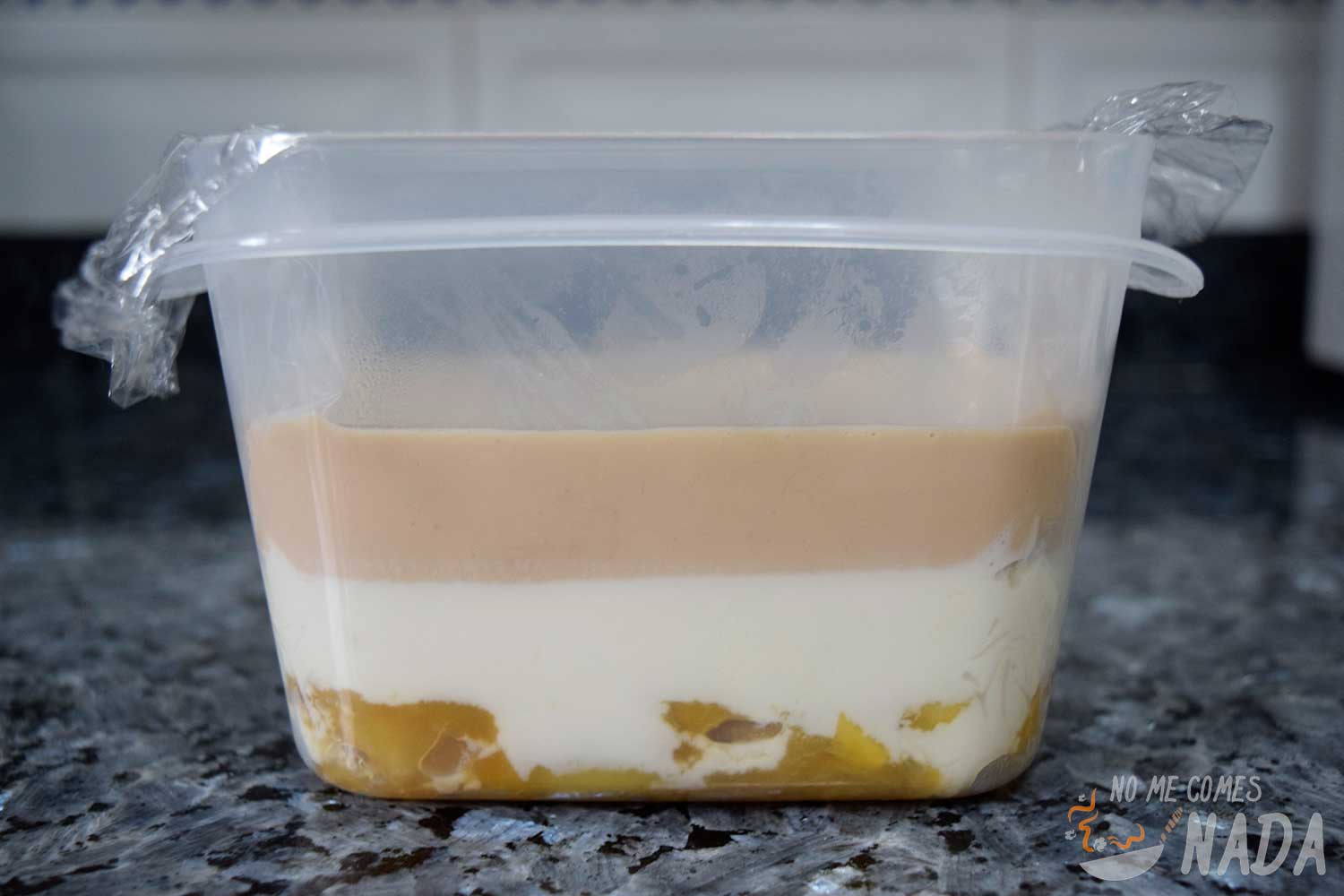 Vertemos la mezcla de queso de cabra sobre la capa de manzana caramelizada. Tened cuidado de no verterlo con mucha fuerza para que no “rompa” la capa de manzana, podéis verter la mezcla sobre una cuchara para evitar esto. Dejamos que se atempere y, posteriormente, lo metemos en la nevera para que se enfríe. Necesitamos que la capa de queso de cabra comience a cuajar (yo esperé casi 1 hora) antes de empezar con la de foie, para evitar que se mezclen cuando vertamos esta última.