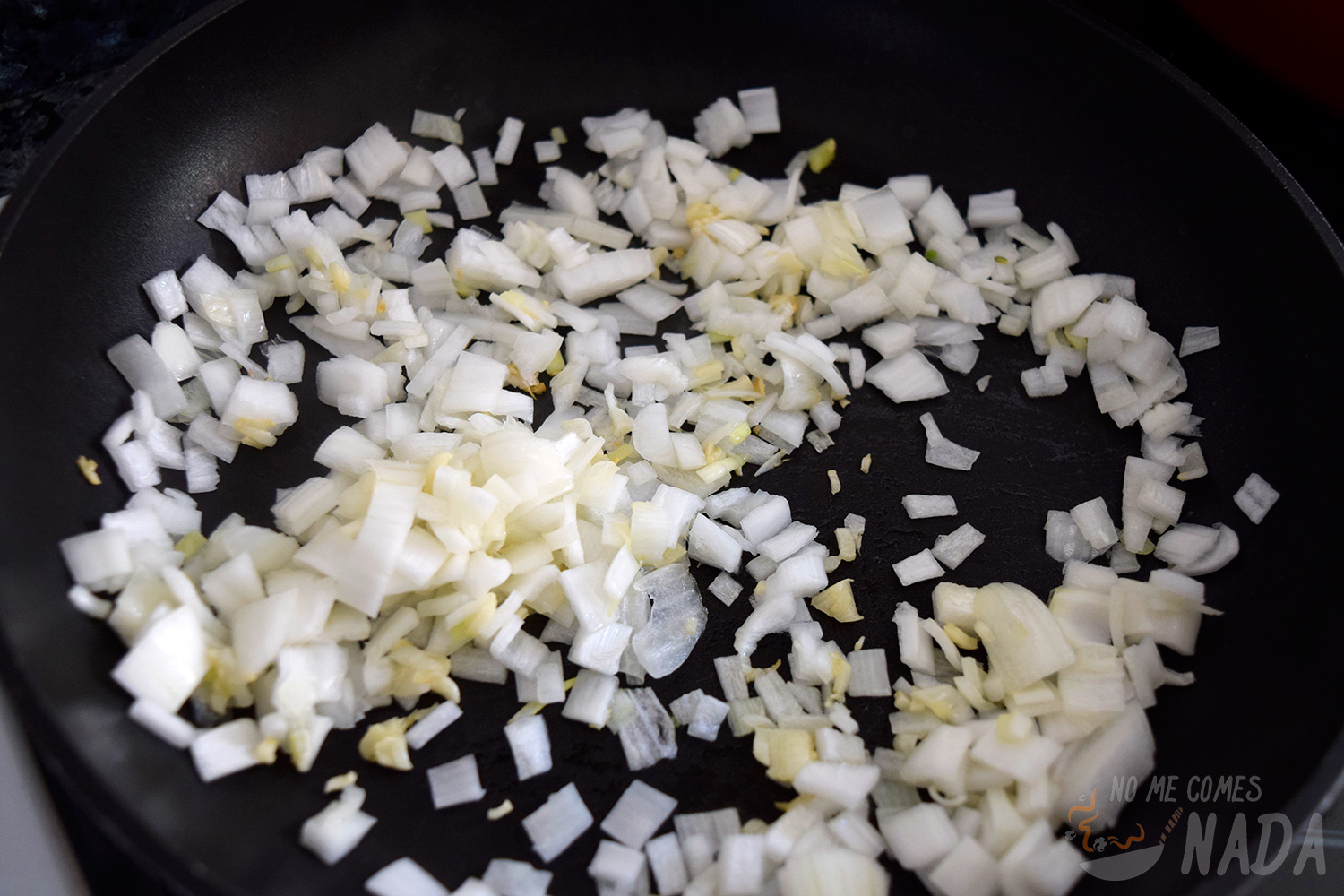 Picamos finamente el diente de ajo y ponemos en un wok (o sartén si no tenéis) con un chorrito de aceite de oliva virgen extra. Cuando empiece a dorarse, añadiremos la cebolleta que también habremos picado finamente. Bajamos el fuego y dejamos pochar lentamente hasta que empiece a ablandarse.