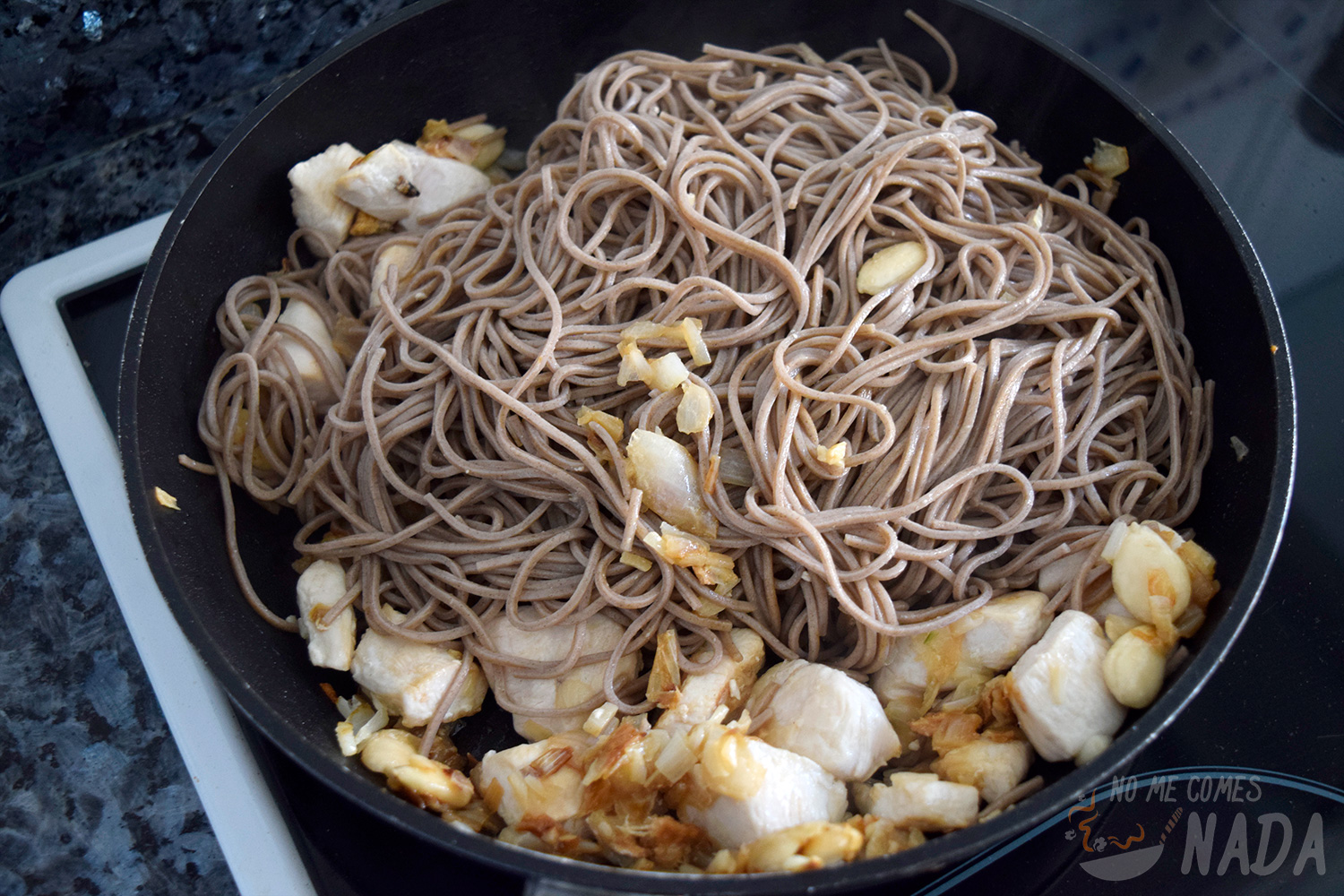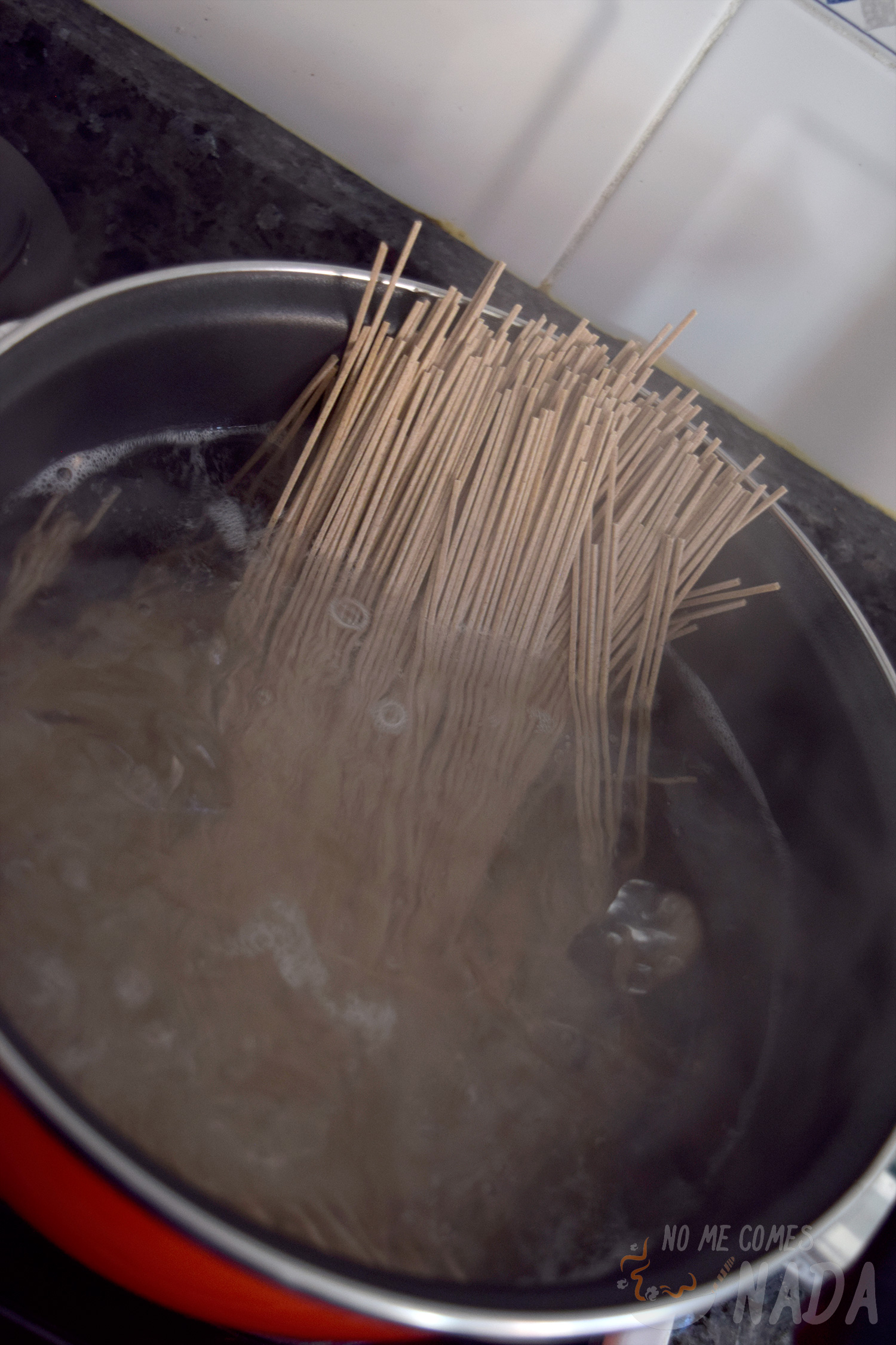 En una cazuela con abundante agua y una pizca de sal, cocemos los noodles o fideos soba según indique el fabricante. En mi caso estaban listos en solamente 6 minutos :) Cuando esté cocidos, escurrimos el agua, pero no los enfriamos bajo el grifo, queremos que se mantengan calientes.
