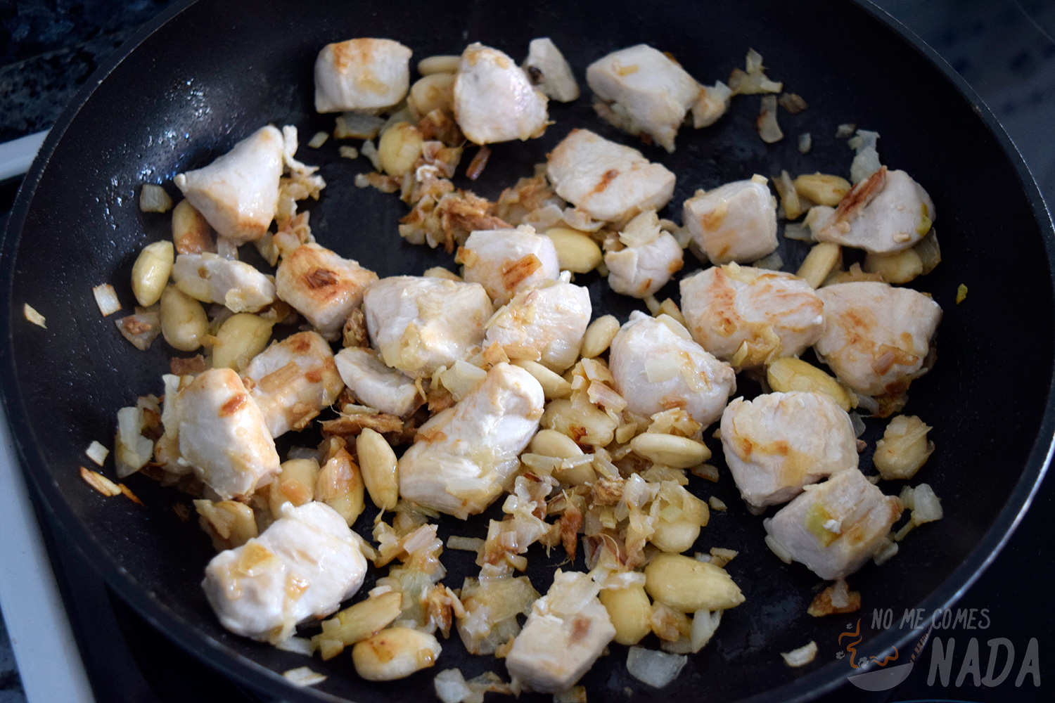 Volvemos a subir un poco el fuego y añadimos las almendras al wok, salteándolas hasta que estén doradas. En ese momento, añadiremos el pollo (bien en tiras estilo fajita o simplemente troceado) y lo cocinaremos hasta que esté completamente hecho.