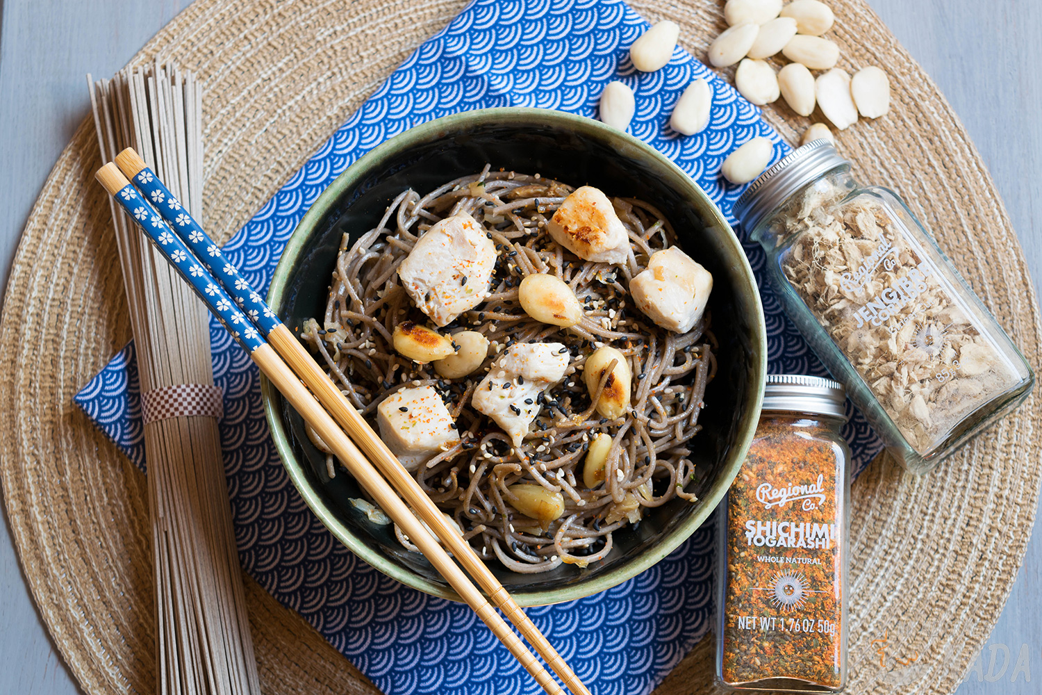 Yo he preparado simplemente estos noodles con pollo y almendras, pero podéis añadirle los ingredientes que más os gusten (calamares, gambas, huevo, bacon, etc.). Además, aprovechando las especias que me enviaron desde Regional.co, los he preparado con un toque picante usando shichimi togarashi y jengibre.