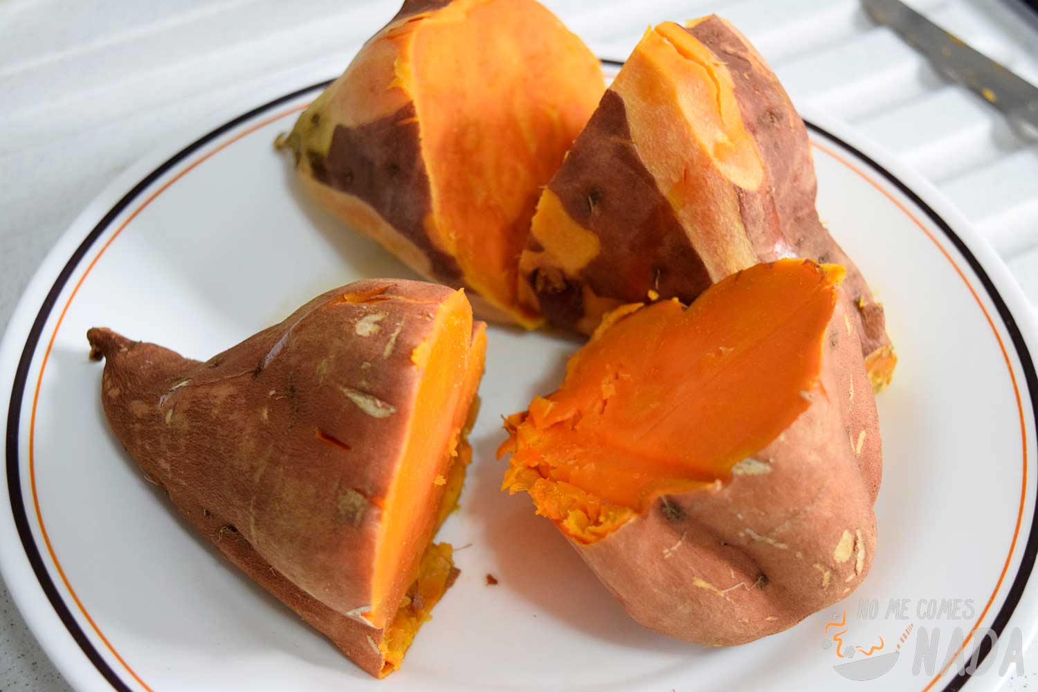 Lavamos los boniatos para quitarles la tierra que traigan y los ponemos en un bol que taparemos con film. Para cocer los boniatos, metemos el bol en el microondas durante 10 minutos. Una vez pasado ese tiempo, pinchamos los boniatos para comprobar si están blandos y, en caso de necesitar más tiempo, los volvemos a meter al microondas (ahora podemos poner en tandas de 3-4 minutos). Cuando estén listo, esperamos a que se templen un poco para que podamos manejarlas.