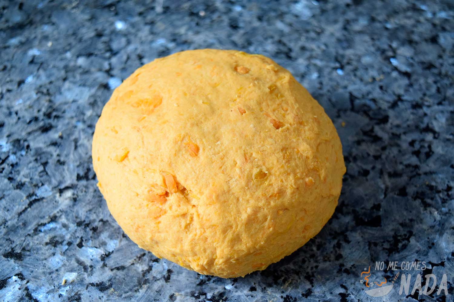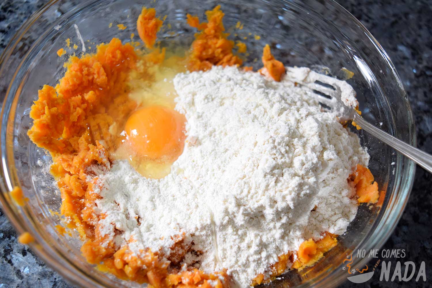 Añadimos al bol el huevo y la harina. No echéis toda la harina de golpe, reservad un poco (50 g, por ejemplo) para ir agregándola poco a poco más tarde. Metemos las manos en la masa y mezclamos (en el bol o en la encimera, donde os sea más cómodo) hasta obtener una masa homogénea. La masa de los ñoquis de boniato tiene que quedar e el punto justo de no pegarse a las manos y, para ello, habíamos reservado la harina. Id incorporando poco a poco (si lo veis necesario) hasta que la masa este en ese punto justo. Cuanta menos harina incorporemos, mejor quedarán los ñoquis de boniato.