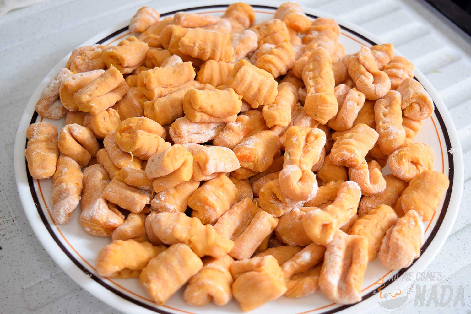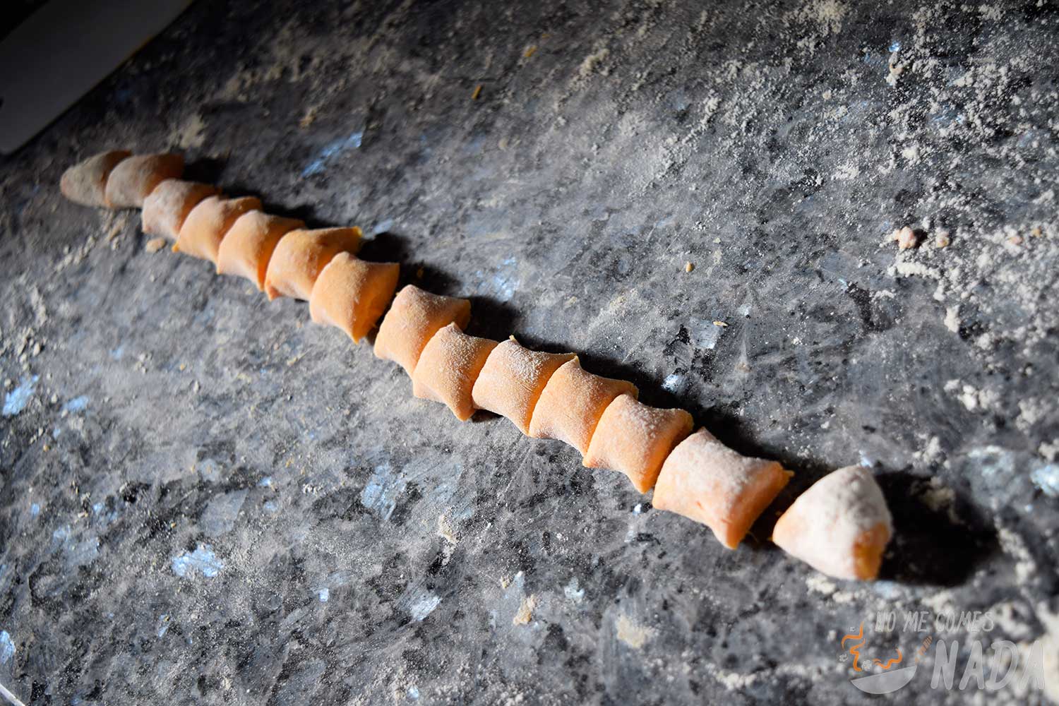 Cuando tengamos la masa lista, la vamos cortando en trozos y la estriamos haciendo “churros” (cilindros alargados) del grosor de un dedo. Cortamos el churro en trocitos, que serán los ñoquis.