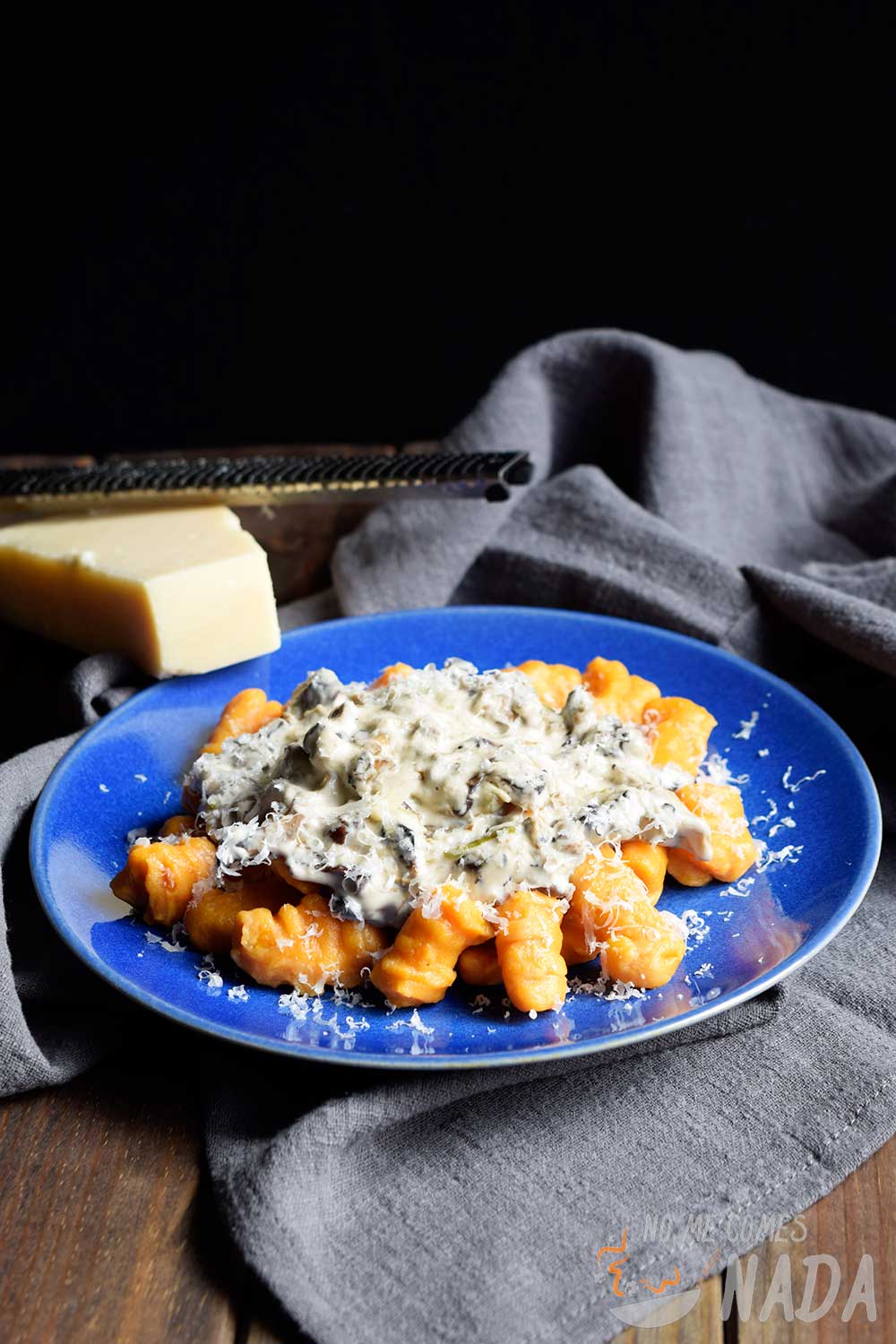 Con el invierno a la vuelta de la esquina, aún estamos a tiempo de preparar un plato de lo más otoñal: ñoquis de boniato con salsa de setas.