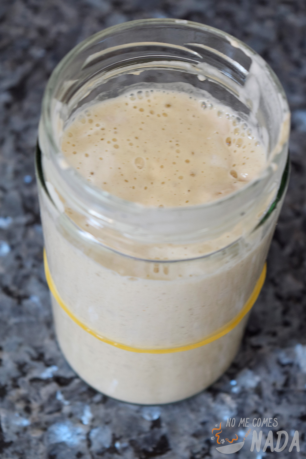 Refrescamos nuestra masa madre con la misma cantidad de harina y agua y dejamos que empiece a trabajar hasta que haya doblado su volumen.
