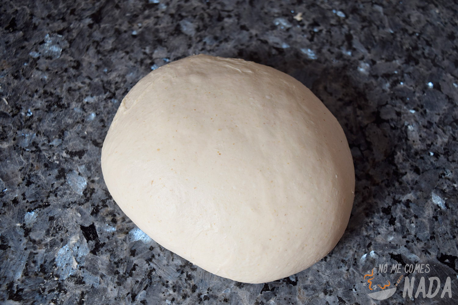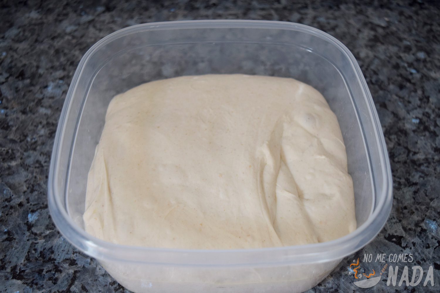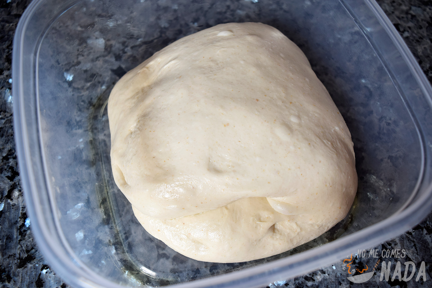 Una vez que tenemos nuestra masa bien amasada, la ponemos en un recipiente ligeramente aceitado y la dejamos tapada con un paño (o podéis usar un recipiente con tapa, como en mi caso) hasta que casi doble el volumen. El tiempo de esta primera fermentación puede variar por muchos factores, en mi caso estuvo un total de 4h.