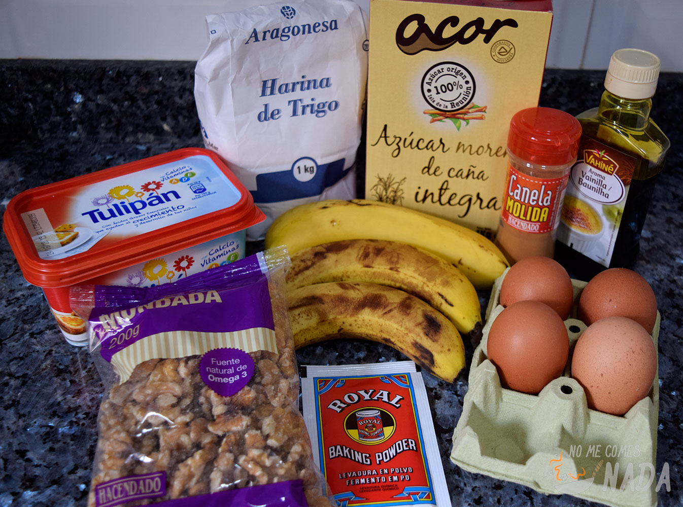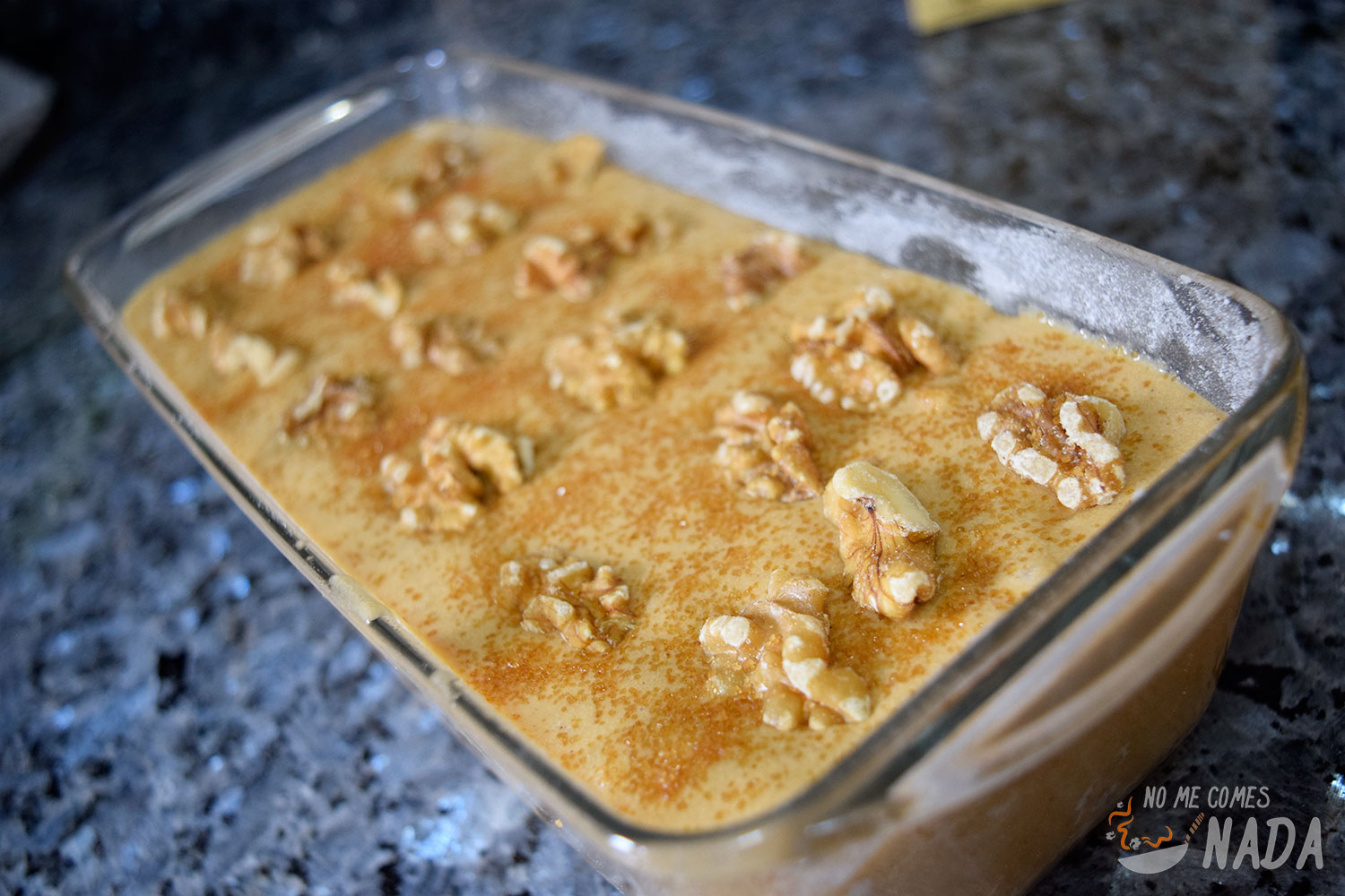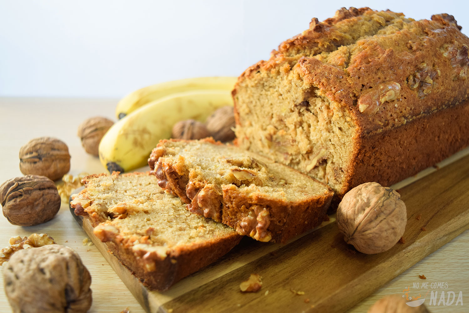 Como toque adicional al pan de plátano, os cuento un truquillo que saqué de La cocina fácil de Lara. Consiste en coronar el pan con una abundante capa de nueces enteras y azúcar moreno, para formar una crujiente costra por toda la parte superior del pan. Os aseguro que quedará increíble.
