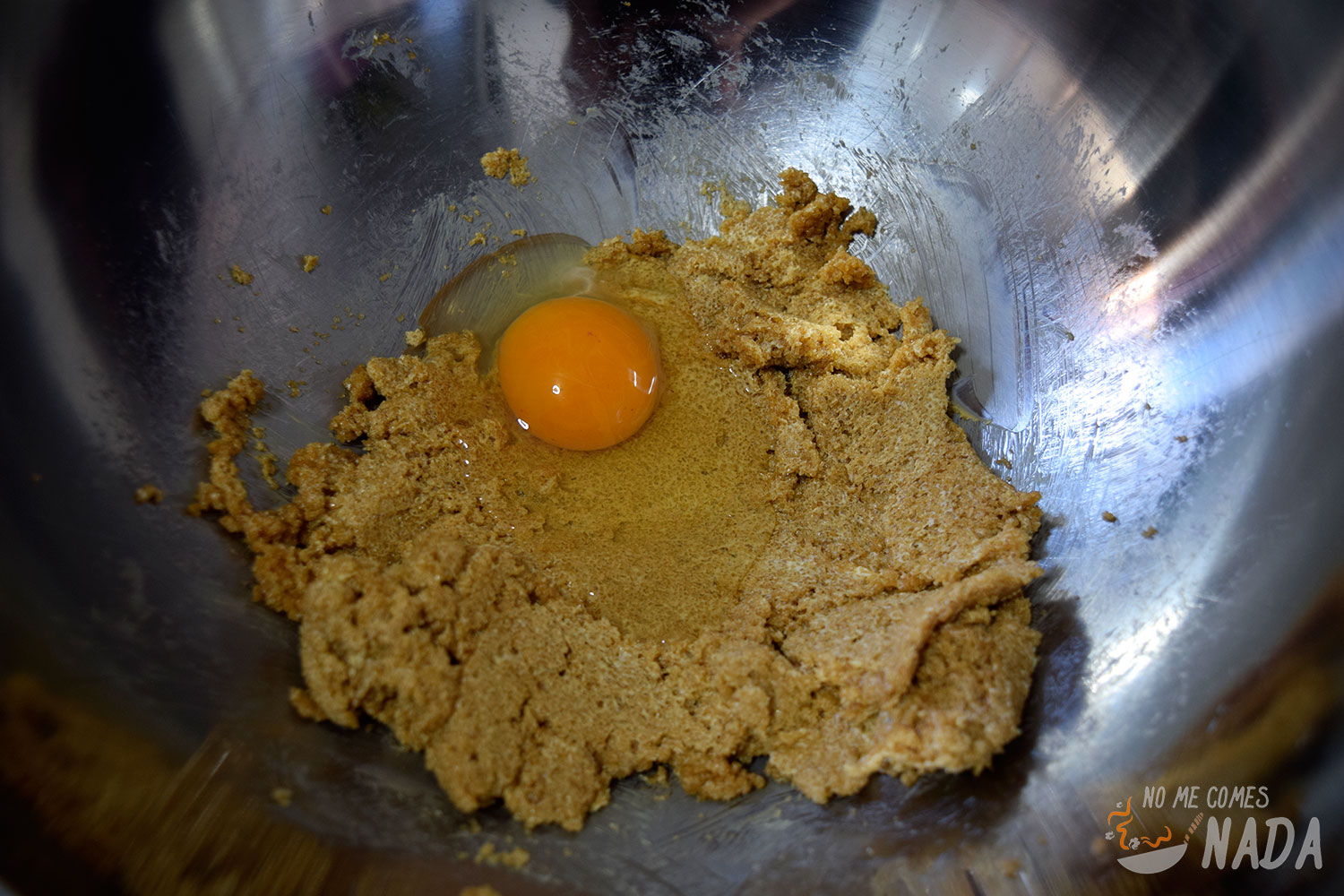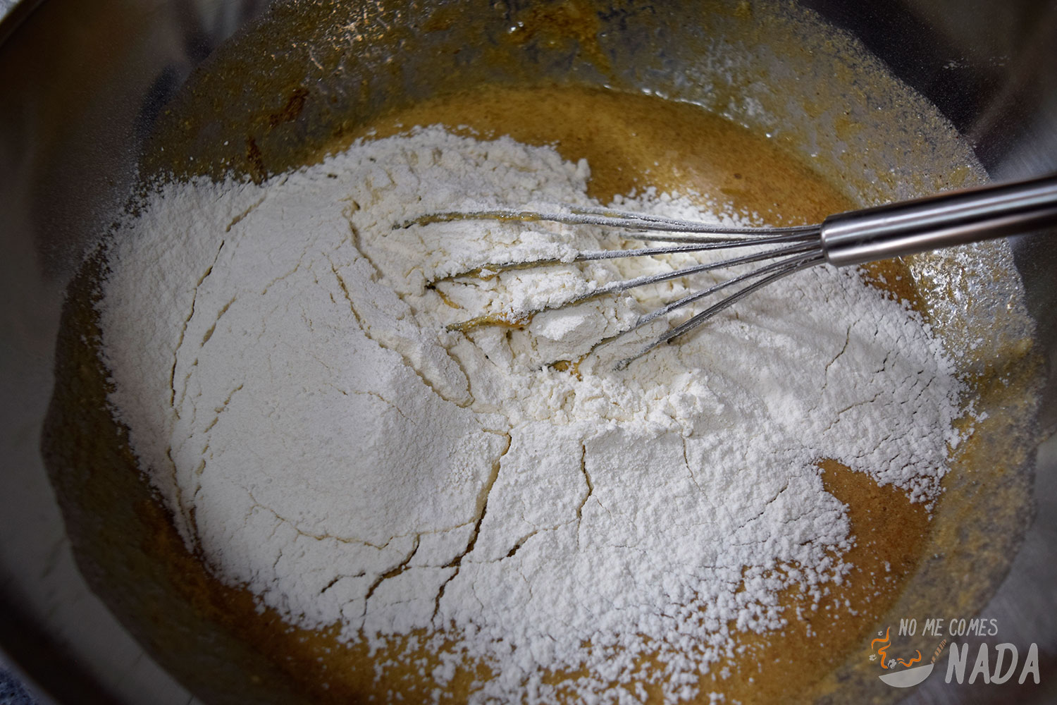 Ahora toca incorporar la harina. Para ello la añadiremos poco a poco, tamizándola con un colador para evitar que se formen grumos y removiendo constantemente para que se integre. En este punto, añadimos también la levadura y un buen puñado de nueces peladas y troceadas (la cantidad exacta de nueces la dejo a vuestro gusto).