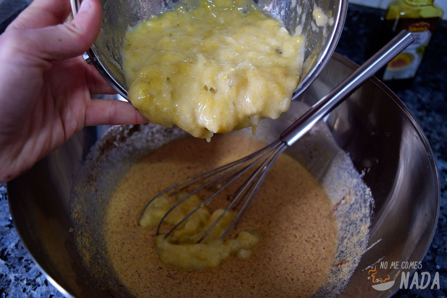 Por otro lado, trituramos los plátanos con ayuda de un tenedor (o un mortero si os cuesta mucho). Si tenéis plátanos que ya empiezan a pasarse de maduros, este pan de plátano os vendrá de lujo para sacarles provecho. Añadimos el puré de plátanos al bol junto con la canela, la esencia de vainilla y una pica de sal. Volvemos a batir para que se mezclen bien todos los ingredientes.