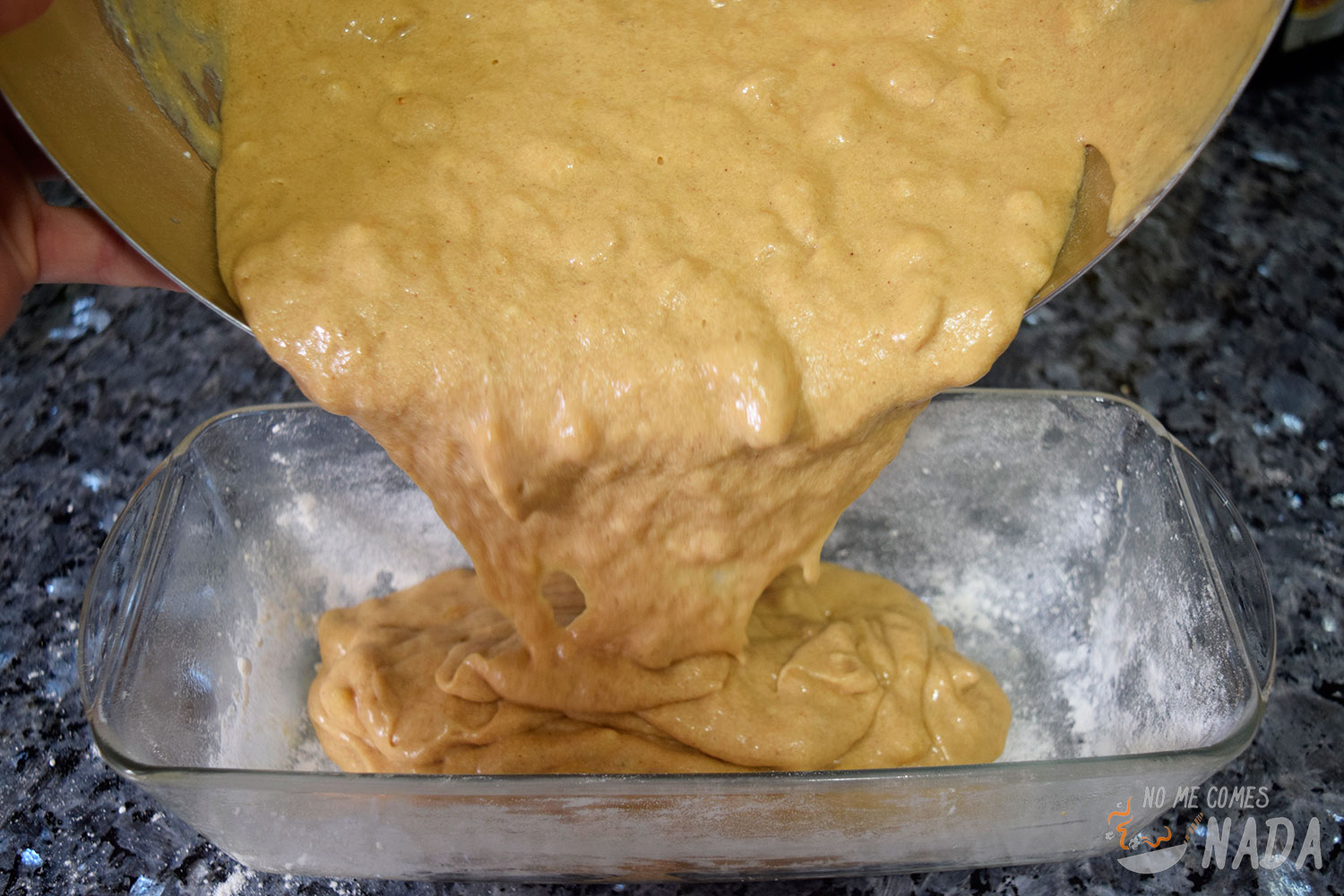 Engrasamos un molde rectangular con aceite o con mantequilla. Yo he usado un molde tipo pyrex pero si tenéis uno típico de bizcochos para facilitar el desmoldado posterior, mejor que mejor. Espolvoreamos también harina sobre todas paredes del molde para evitar que se nos pegue el pan de plátano. Vertemos la masa del pan en el molde, dando al final un par de golpe sobre la encimera para que no queden burbujas en la masa.