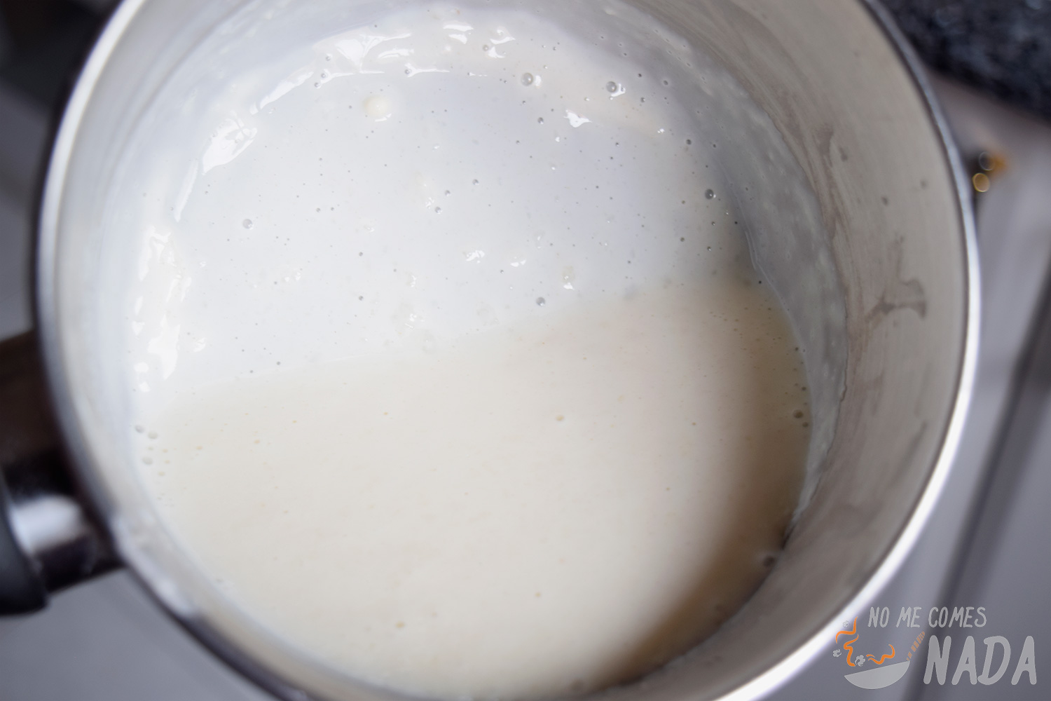 Empezaremos la receta preparando el tang zhong. Para ello simplemente tenemos que poner la leche y la harina en un cazo, disolviendo esta última con ayuda de unas varillas. Calentamos la mezcla a fuego bajo durante unos minutos, el tiempo justo para que la mezcla empiece a espesar y forme una especie de papilla. Retiramos del fuego y dejamos enfriar.