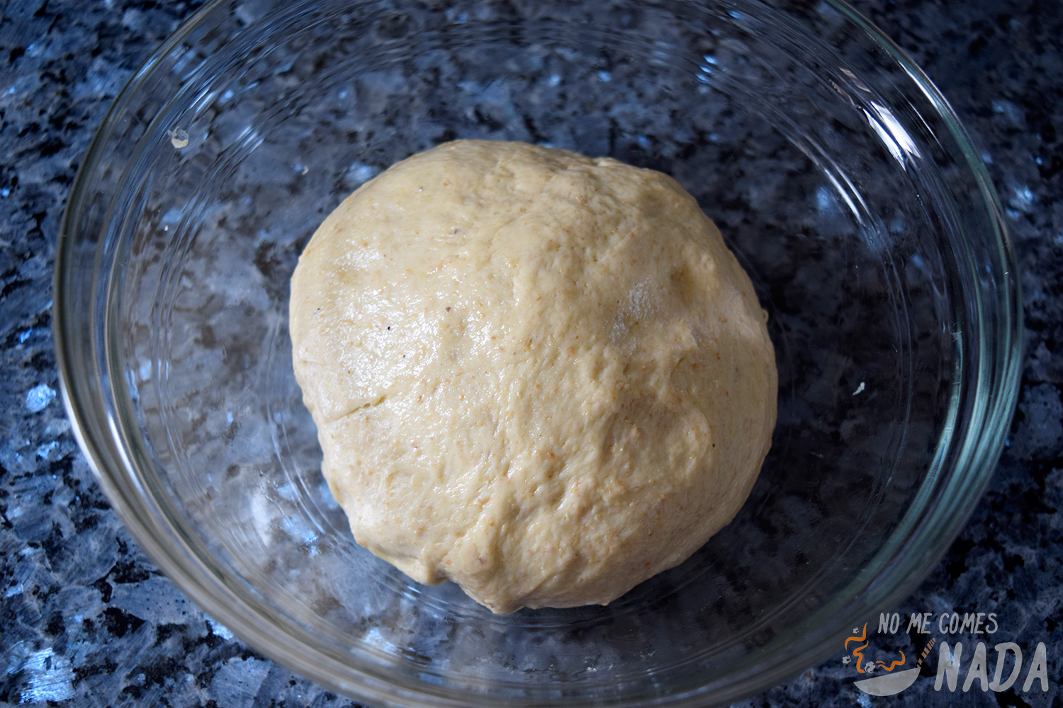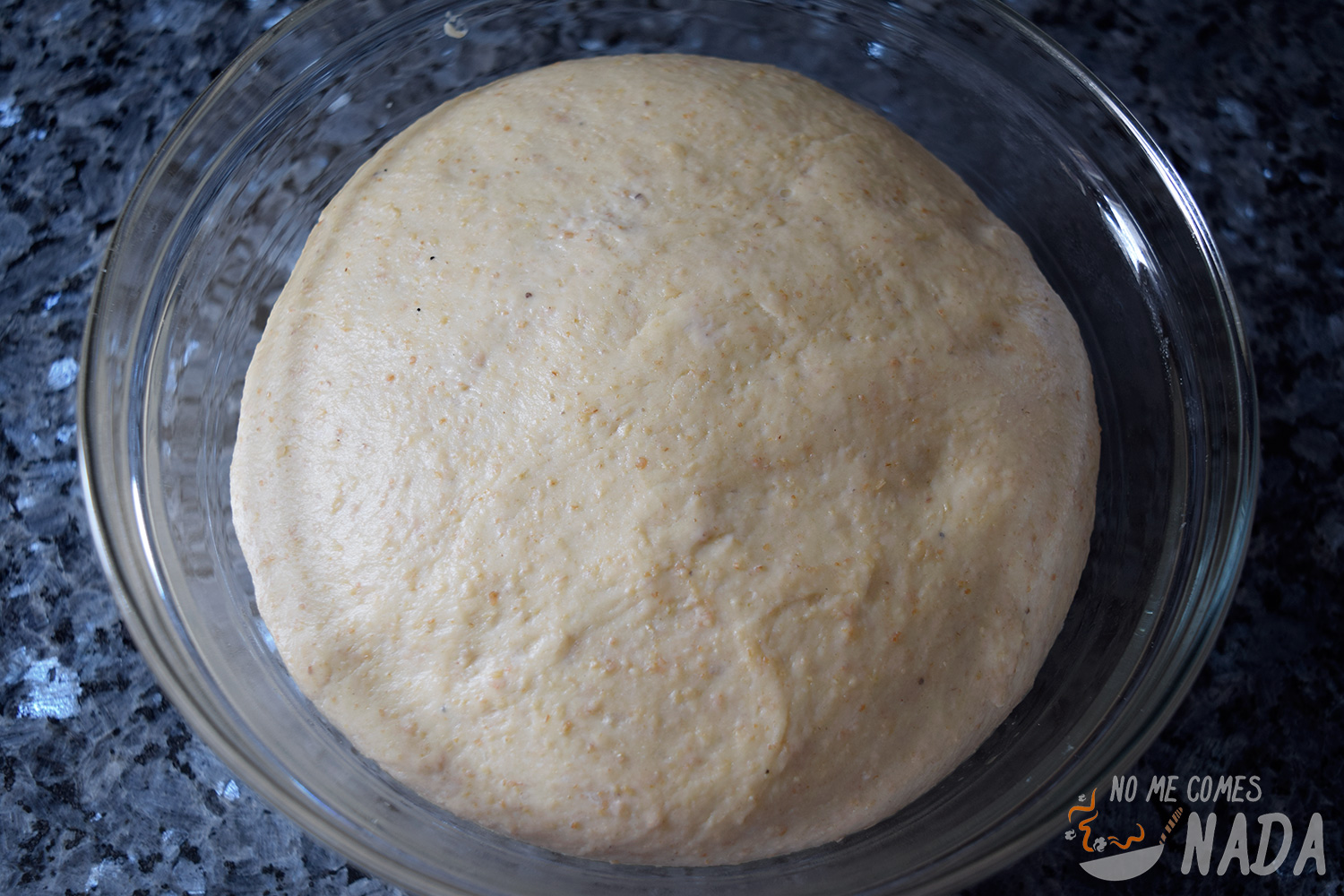 Dejamos levar la masa en un cuenco ligeramente aceitado y tapada con un paño, hasta que prácticamente doble su volumen. ¿El tiempo? Pues depende un poco del tipo de harina, de la temperatura de la habitación, del amasado, etc. En mi caso estuvo fermentando durante 2 horas.