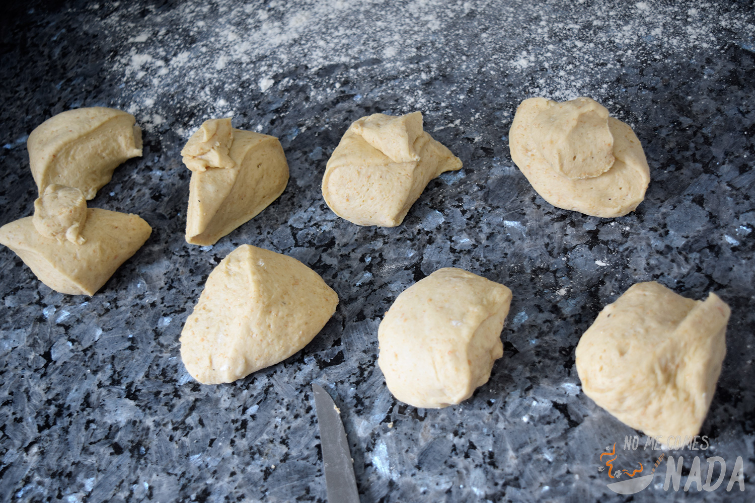 Pasado ese tiempo, devolvemos la masa a la mesa de trabajo y la amasamos un poco, haciendo fuerza para desgasificarla, queremos una miga uniforme sin alveolos. Dividimos la masa en 8 porciones del mismo peso, le damo una preforma de bola y dejamos reposar 10-15 minutos.
