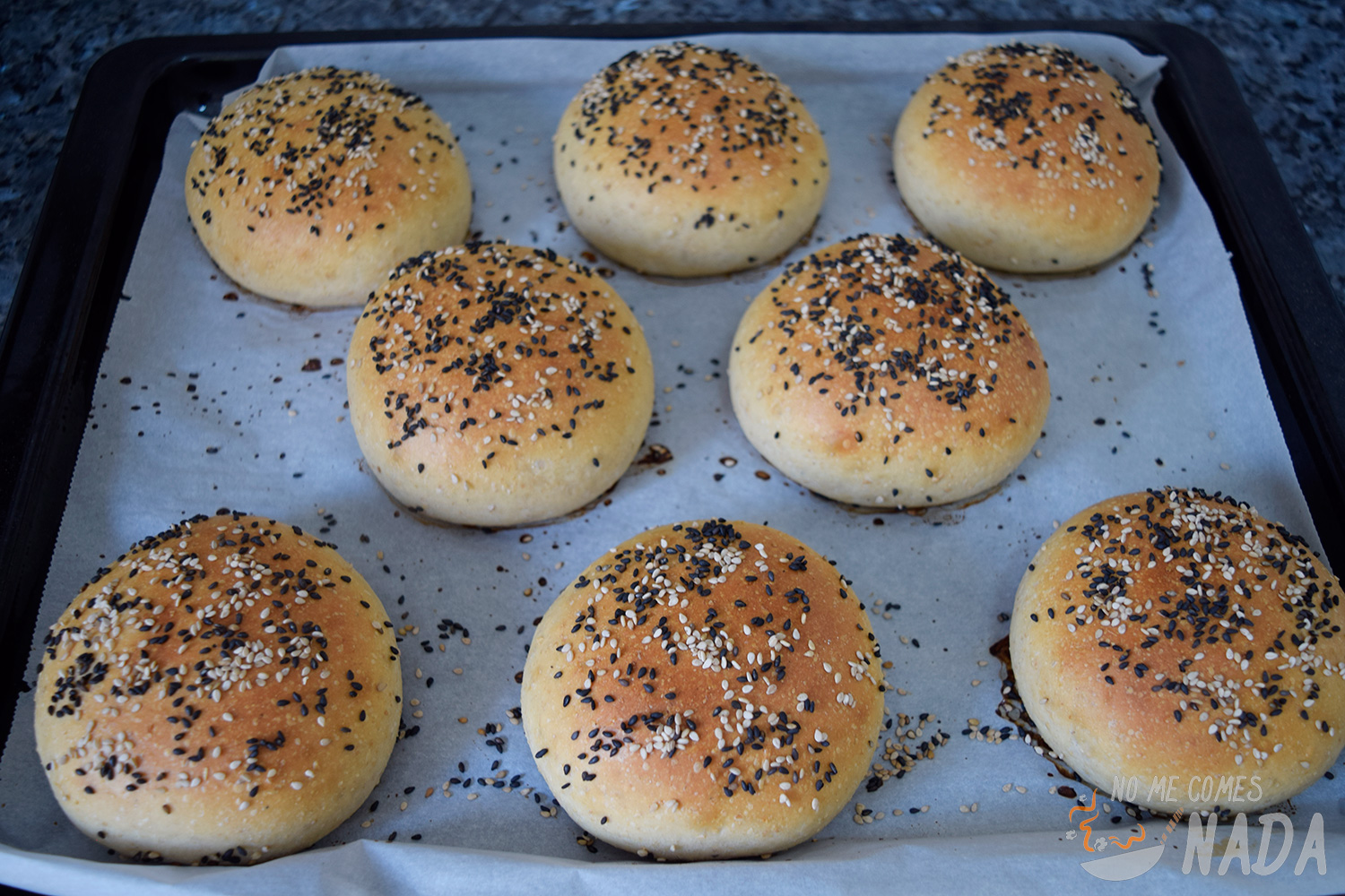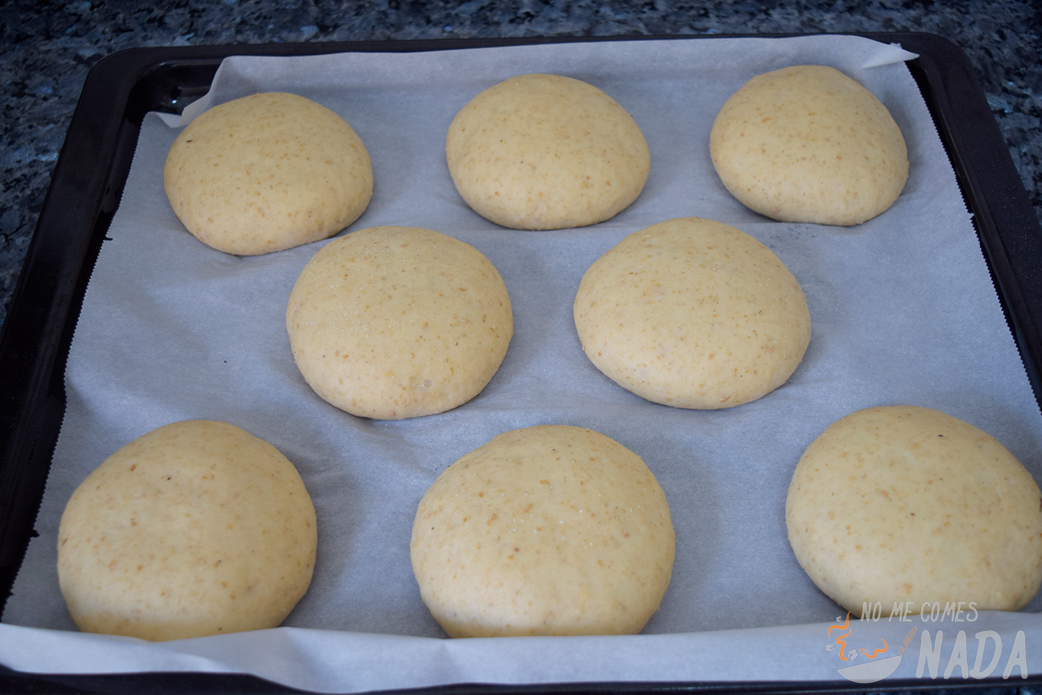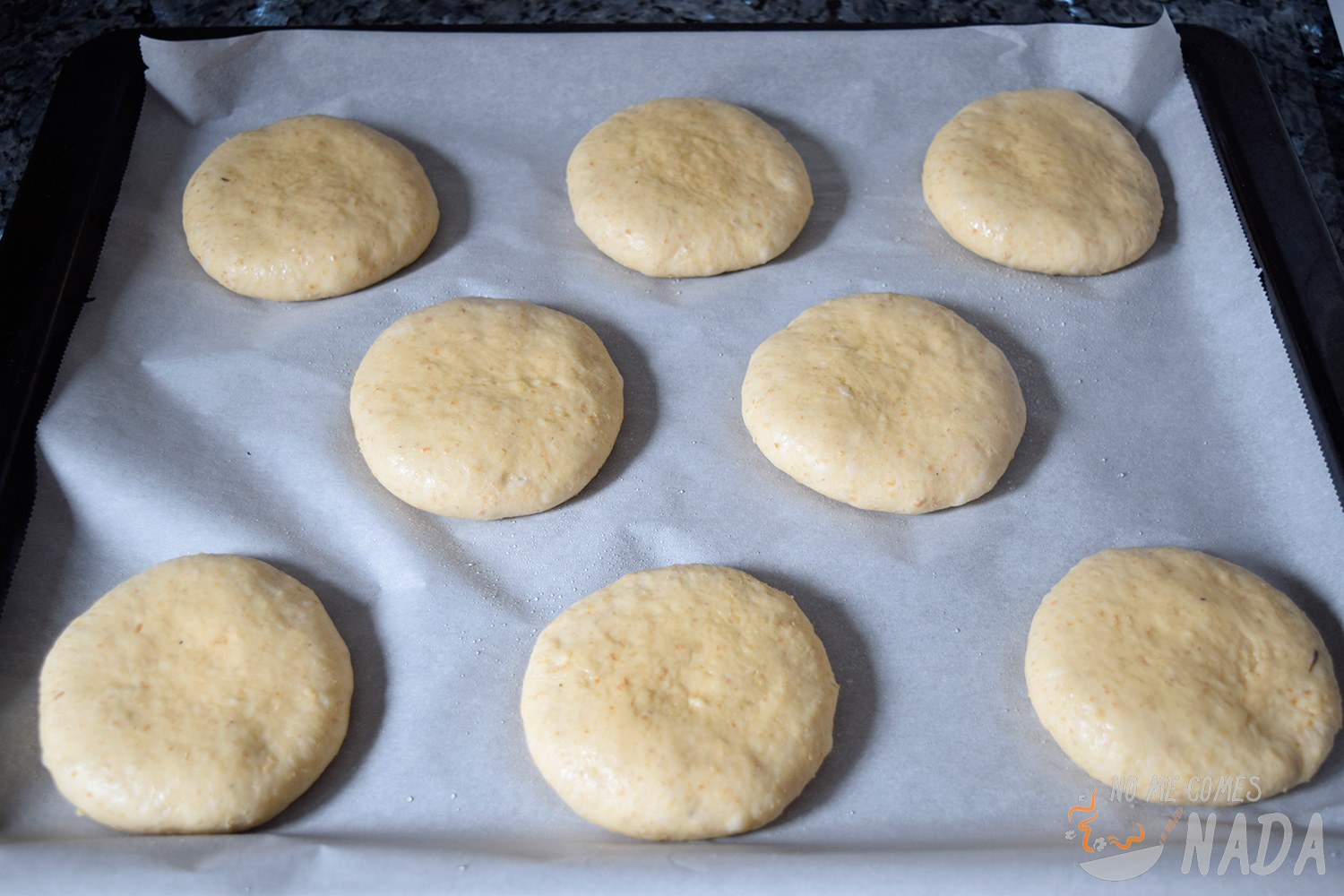 Colocamos los panecillos de hamburguesa sobre papel de horno y los aplastamos ligeramente con las manos. Mantened cierta separación entre los panecillos para evitar que se junten cuando crezcan. Dejamos que hagan la segunda fermentación hasta que vuelvan a crecer en volumen (igualmente, en mi caso estuvieron otras 2 horas).