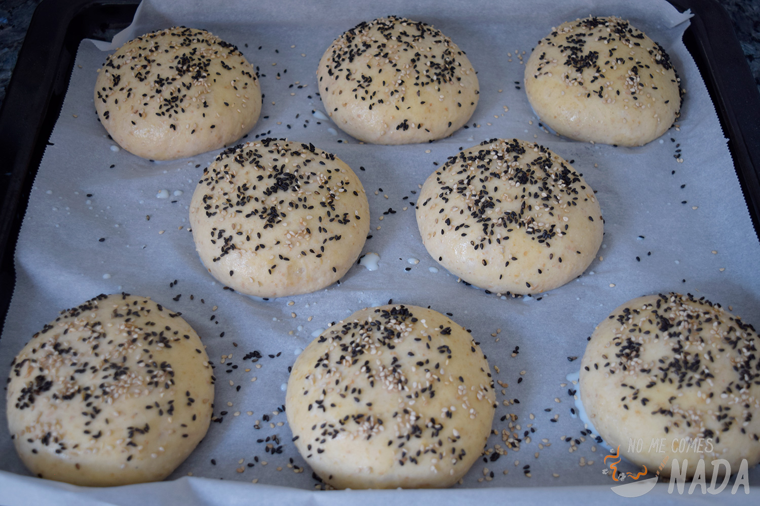 Cuando estén listos, pintamos los panecillos con leche y espolvoreamos unas semillas por encima (yo usé semillas de sésamo blanco y negro). Metemos al horno precalentado a 200ºC durante unos 15 minutos o hasta que estén dorados (ya sabéis, cada horno es un mundo y hay que vigilar los tiempos). Sacamos del horno y dejamos enfriar completamente sobre una rejilla.