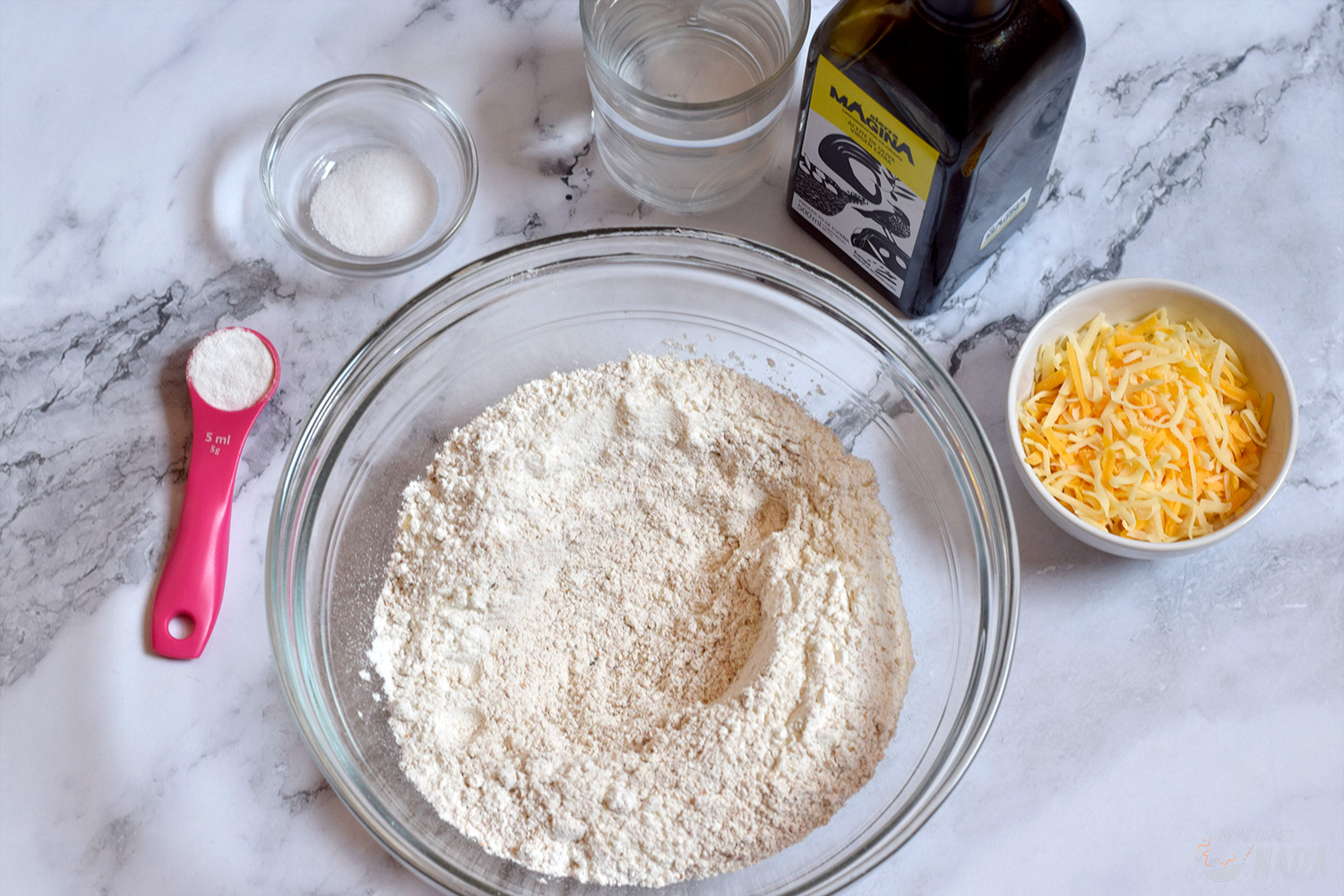 En un bol amplio añadimos todos los ingredientes (excepto el queso para el relleno) y amasamos hasta obtener una masa lisa. Podemos amasar directamente en el bol o volcando la masa en la encimera, que será más cómodo. Tapamos con un paño y dejamos reposar la masa de 15 a 30 minutos.