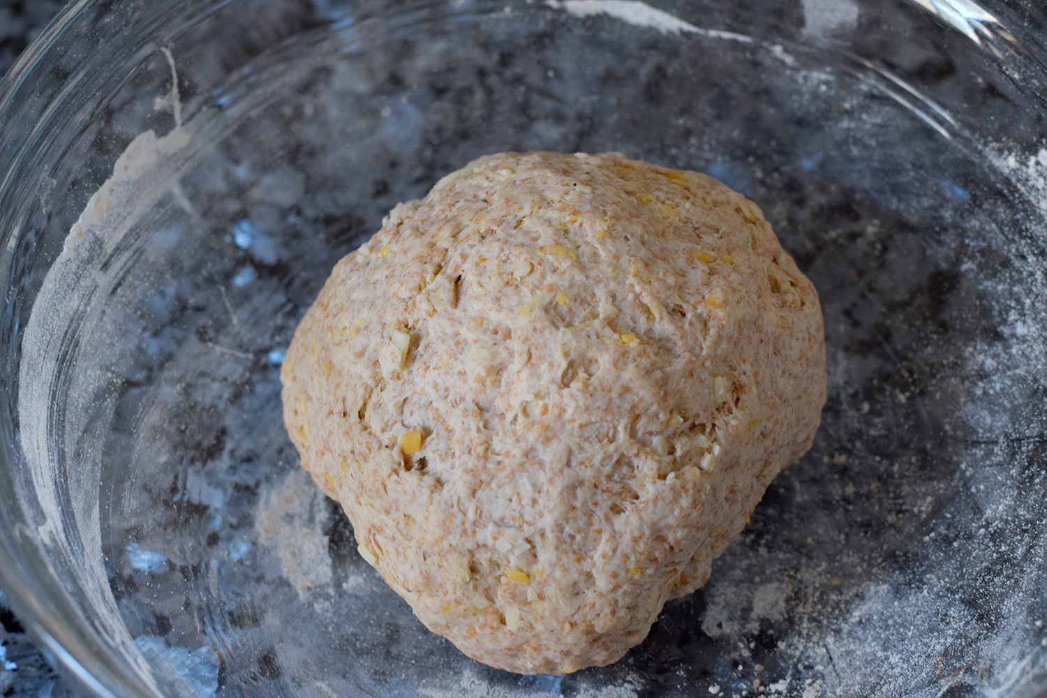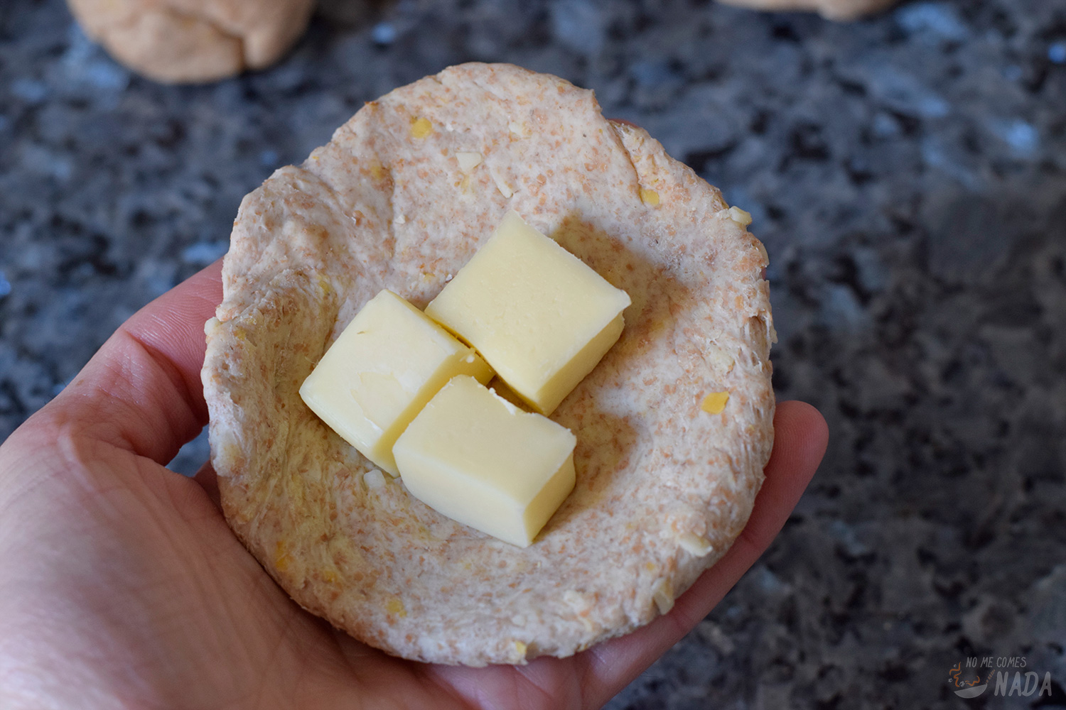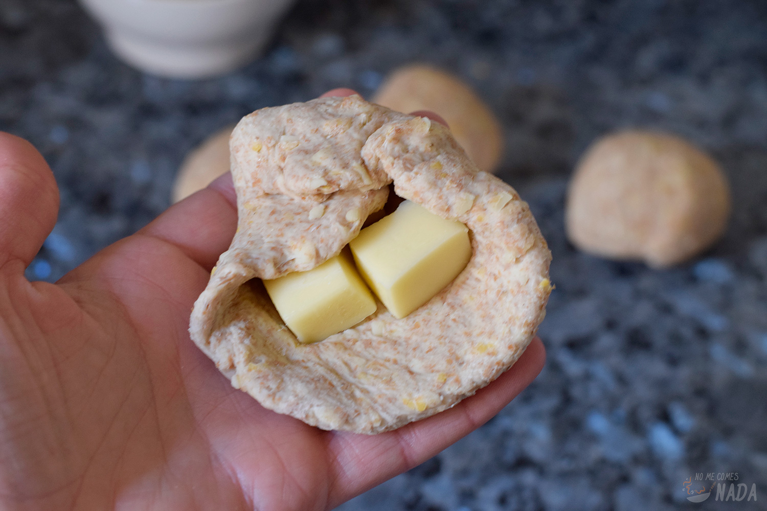 Dividimos la masa en 5 o 6 porciones y hacemos bolitas con cada una de ellas. Estiramos cada una de las bolas (ya sea con las manos o con ayuda de un rodillo) y colocamos un poco de queso en el centro de la masa (cantidad de queso al gusto). Cerramos el panecillo llevando los bordes hacia el centro, formando una especie de saquito. Sellamos bien el “cierre” de la masa para evitar que se salga el queso y aplanamos un poco el panecillo.