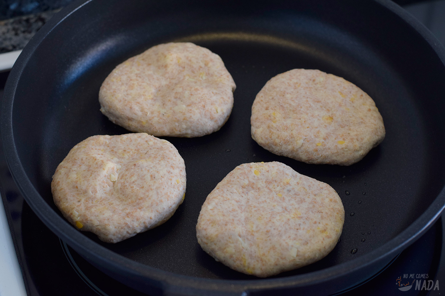 Pintamos una sartén con aceite de oliva y, cuando esté caliente, ponemos los panecillos de queso en ella. Cocinamos, tapados, unos 5 minutos por cada lado, hasta que se empiecen a dorar/tostar.