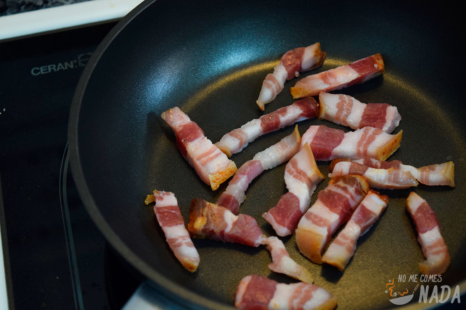 Mientras, iremos friendo la panceta o tocino entreverado (o bacón en su defecto) en una sartén. Las patatas revolconas suelen servirse con torreznos, que son tiras de tocino fritos incluyendo la piel, pero como en casa es más complicado hacerlos, los sustituiremos por tiras de panceta para facilitar la labor. Ponemos una sartén a fuego medio-bajo con una o dos cucharadas de aceite de oliva virgen extra y, cuando esté caliente, echamos los trozos de panceta. La idea es que se vayan haciendo poco a poco y se vayan dorando sin llegar a quemarse, queremos trozos bien crujientes y doraditos :) Una vez hechos, los sacamos de la sartén, dejando el aceite y la grasa que hayan soltado y los reservamos.